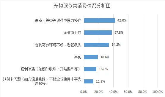 洗澡、美容等过程中暴力操作占总人数的42.0%(210人);无资质上岗占比37.8%(189人);宠物寄养环境不好、看管缺失占比34.2%(171人);强制消费占比16.8%(64人);预付卡问题占比12.8%(64人);其他占比18.6%(93人)。(详见下图)