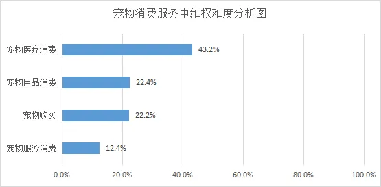 宠物医疗消费被认为是最难解决或维权的领域,占总人数的43.2%(216人);宠物用品消费占比22.4%(112人);宠物购买占比22.2%(111人);宠物服务消费占比12.4%(62人)。医疗行业的专业性与信息不对称性导致维权难度较高。(详见下图)