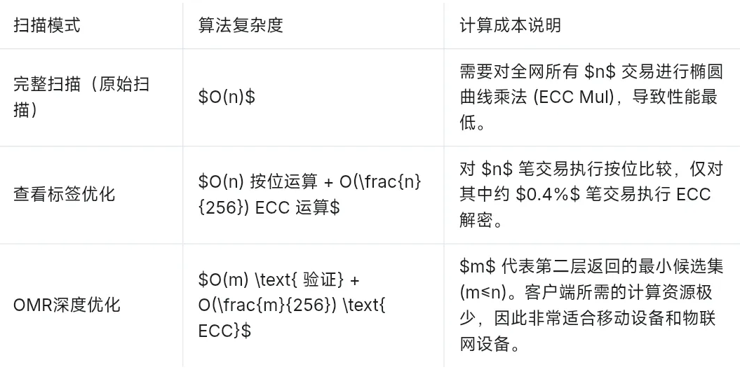 - 效果:接收方只需比对区块链上的 view_tag 即可。由于该标签仅为 1 字节(256 种可能性),因此只有大约 1/256 的交易能够成功匹配。这意味着在执行代价高昂的椭圆曲线乘法运算之前,99.6% 的无关交易已被过滤掉。