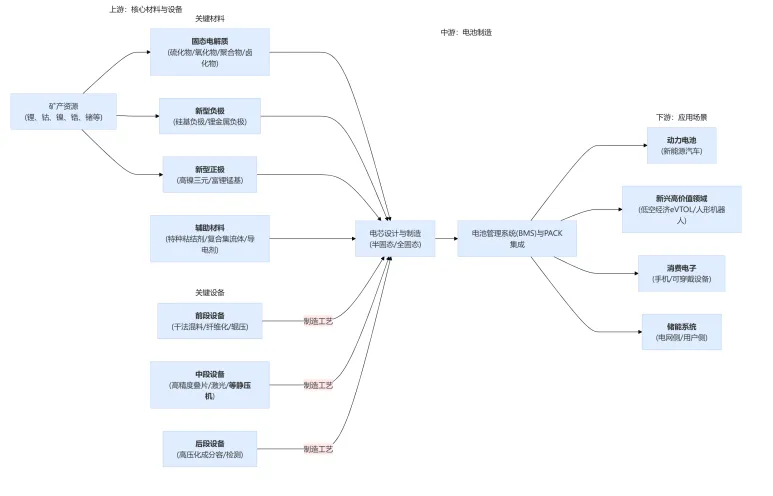 上游是固态电池革命的策源地,技术壁垒最高,是决定产业化进程和成本的关键。