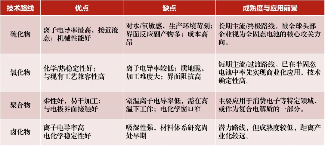 ①固态电解质:是固态电池的“心脏”,价值量占比高,技术路线仍在收敛中。依据电解质材料体系划分,包括氧化物、硫化物、聚合物和卤化物四大技术路线。