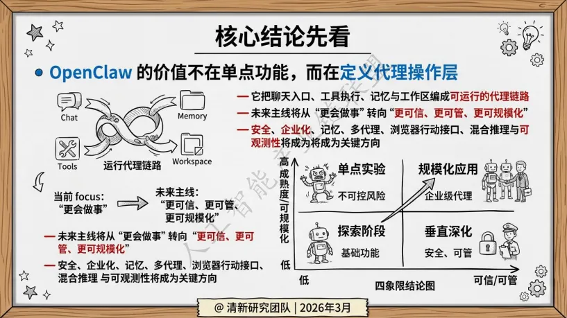 对行业而言,研究OpenClaw就是在研究Agent如何进入真实世界。它正在把AI从“会聊天的助手”转变为“可治理的行动型操作层”,这可能是未来十年AI发展最重要的方向之一。