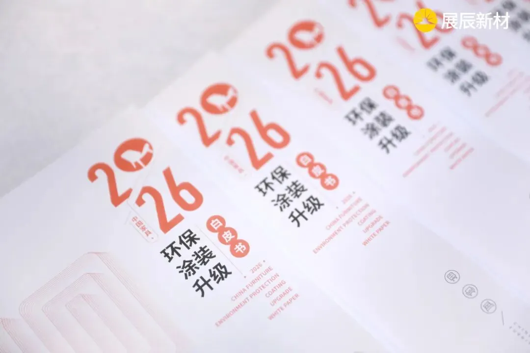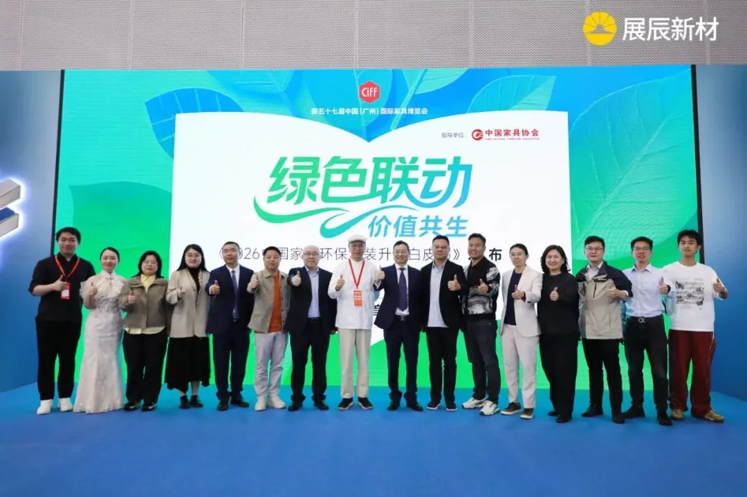 2026年3月20日,春分时节,羊城广州,万物并秀。第五十七届中国(广州)国际家具博览会论坛区内,一场聚焦家具产业绿色未来的行业盛会如期举行。在中国家具协会的指导下,展辰新材携手中国家具行业第一本全国中文核心期刊《家具与室内装饰》杂志、全球家居业商业指南《今日家居》、全球最大的空间设计平台酷家乐以及家居产学研基地博木院,共同编制并发布了《2026中国家具环保涂装升级白皮书》。