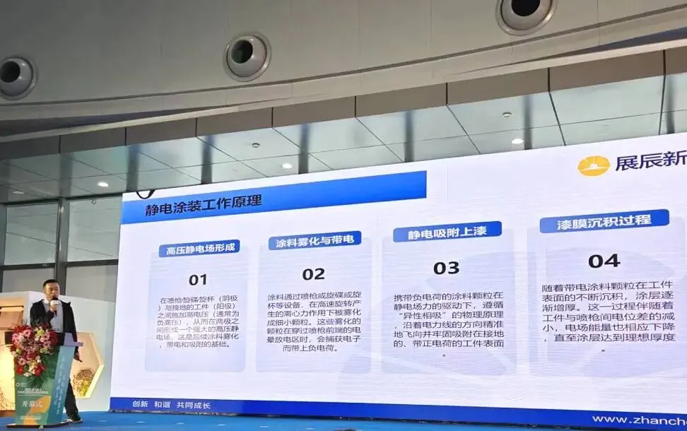 展辰新材技术管理中心机械涂装部经理夏全辉在展会上重点分享了水性及UV涂料静电涂装技术的应用实践,从设备适配、工艺参数到喷涂效率与环保效益,系统呈现了静电涂装在家具制造中的落地路径,引发众多观展企业的关注与探讨。