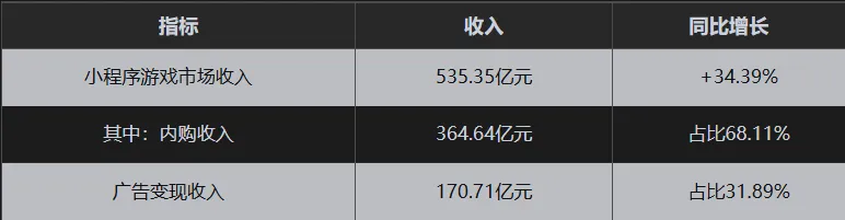 535.35亿元规模、34.39%增速,小程序游戏已成为连接轻量玩家与重度游戏的“新流量枢纽”,内购占比持续提升,商业模式日趋成熟。