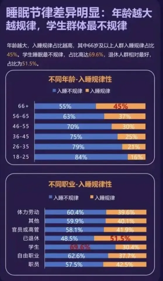 规律性:69.6%的学生睡眠不规律,是所有群体中最差的
