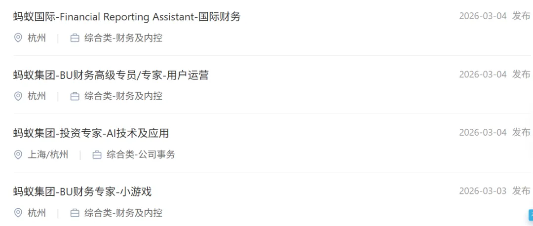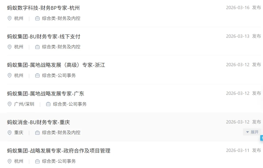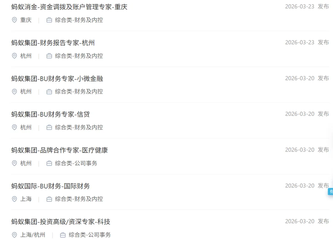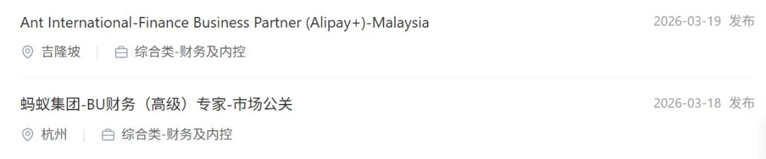 社招推送:蚂蚁集团招聘财报专家/BU财务专家/FBP/投资专家/运营专家等,杭州/上海/重庆/吉隆坡.