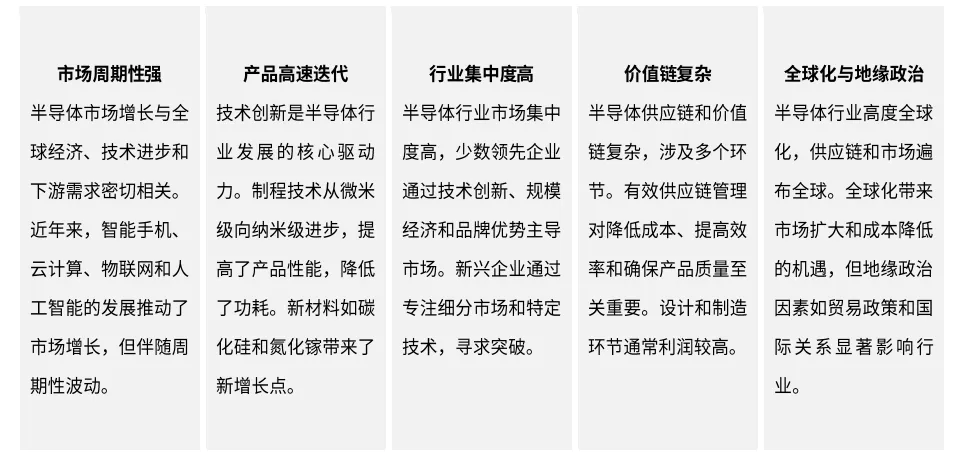 半导体行业在全球化和技术革新的推动下,展现出多维度和多层次的特点。市场增长与全球经济、技术进步和下游需求密切相关,智能手机、云计算、物联网和人工智能的发展推动了市场的稳步增长,但伴随周期性波动。技术创新是核心驱动力,制程技术进步和新材料应用提升了产品性能。行业市场集中度高,少数领先企业主导市场,新兴企业通过技术创新寻求突破。供应链复杂,管理对降低成本和提高效率至关重要。全球化带来机遇,但地缘政治因素显著影响行业,企业需通过市场多元化和供应链韧性应对挑战。