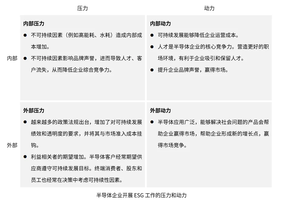 随着半导体行业的快速发展,作为资源密集型产业,其发展过程中的ESG问题也引起了社会各界的广泛关注。例如半导体制造过程中需要大量的水、电和化学品,对环境产生巨大影响。当我们在分析行业ESG时,既要看压力,也要看动力。压力源自“不可持续带来的风险”,动力来自“可持续发展为企业带来的益处”。半导体行业兼具以上两种特征,随着政府、投资者、链主等利益相关方的可持续发展意识的增强,半导体行业也面临着更大的ESG压力。而半导体作为数字经济的核心、现代化产业发展的基石,在社会的可持续转型可以发挥巨大作用,实施可持续发展战略的企业也会面临更多机遇,因此有动力开展ESG工作。因此,半导体企业尤其是头部企业,天然较为重视ESG,部分企业优秀做法走在ESG发展前列,对其他行业依然有借鉴意义。