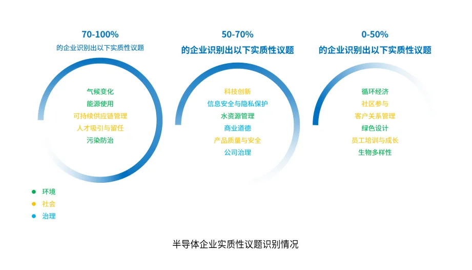 在探讨半导体行业ESG发展的第一步,要了解该行业的ESG实质性议题。实质性议题是指对企业的长期价值和利益相关者有重大影响的ESG问题。研究ESG时先识别这些议题,有助于企业聚焦关键领域,优化资源配置,提高管理效率,增强透明度和投资者信心,推动可持续发展。我们选取了全球市值排名靠前且公布了ESG/可持续发展实质性议题的半导体行业企业,统计他们识别出的实质性议题,发现了一些共性如下图。下面我们选取其中的重要议题展开介绍。