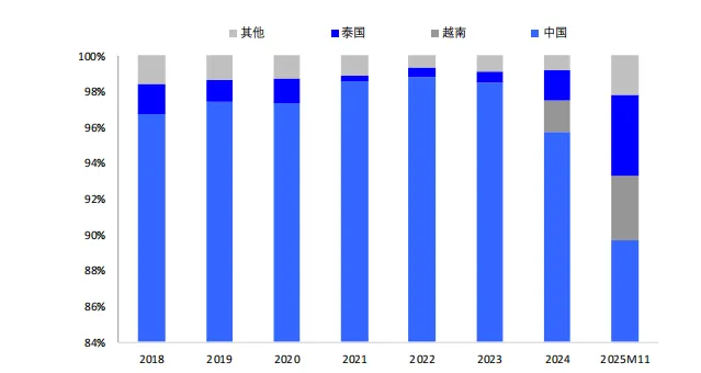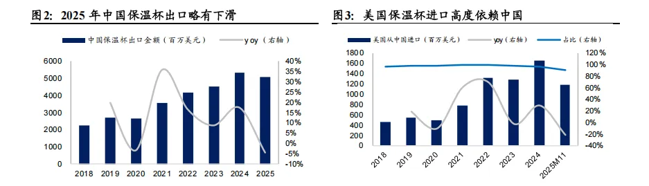 中国当前仍为全球主要的保温杯生产国。中国作为全球最大的保温杯生产国,2024 年产量占全球 65%以上。2020-2024 年我国保温杯出口金额由 26.24亿美元增至 52.99 亿美元;2025 年出口金额 50.70 亿美元,同比出现小幅下滑。美国市场对中国保温杯的进口依赖度持续维持在高位,2024 年之前维持在 95%以上,2025 年 1-11 月从中国进口占比小幅下降至 89.7%。