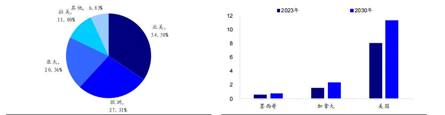 美国是保温杯市场主要消费地。2023 年北美保温饮具市场规模为 10.32 亿美元,占全球市场份额的 34.5%,抢占保温饮具市场主要地位。2023 年美国保温杯市场的收入为 8.11 亿美元,预计以 4.9%的复合年增长率到 2030年将达到 11.34 亿美元,抢占北美保温饮具市场主要份额。美国消费者对环保和可持续产品的需求增长、户外休闲活动以及不断扩张的旅游业也增加了对保温杯的需求。