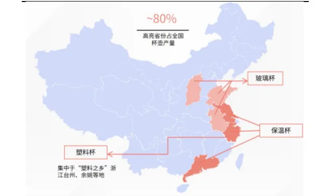 中国保温杯产业链集群特征明显。中国保温杯产业带以长三角和珠三角为核心,形成了以浙江永康/武义、广东潮安/揭阳为主导的产业集群,具有显著的规模效应和区域分工特征,核心省市占国内产量约 80%。