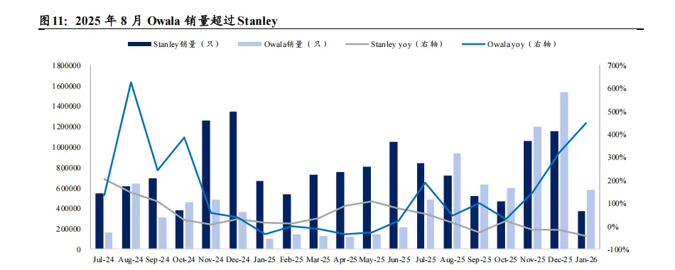 Owala 始终保持高速增长态势,销量超过 Stanley。2025 年 8 月 Owala 销量达到 94.08 万只,首次超越同期 Stanley 的 71.82 万只,并在 2025 年 12 月攀升至 153.50 万只的峰值。同比增速方面,Owala 在多数月份维持高双位数至三位数增长,而 Stanley 自 2025 年下半年起增长明显放缓。