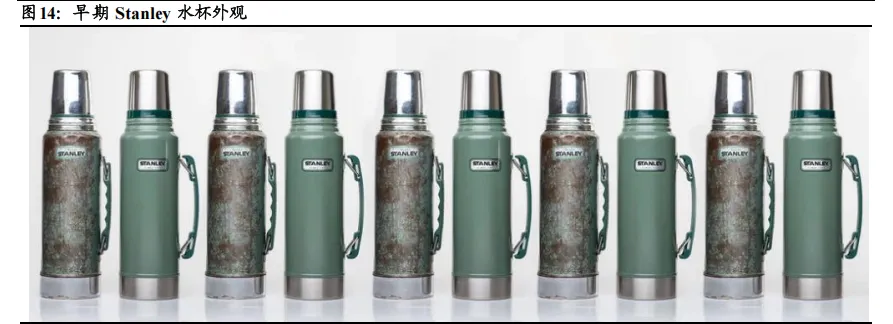 Stanley 具有百年品牌文化积淀。Stanley 品牌成立于 1913 年,William StanleyJr.在 1913 年发明了钢制真空瓶,该品牌最早的目标人群是工人和参加露营徒步的户外人士,设计以简单、简约为主。现在最火的 Stanley 保温杯大部分来自Stanley品牌内部的Quencher 系列,2017年时Stanley Quencher系列的销量在一众欧美保温杯中并不突出,甚至在后来一度传出停产的消息。