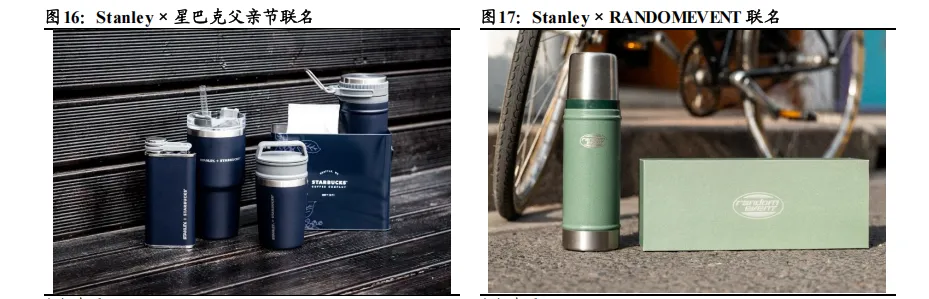 大量推出联名限定款式。例如 Stanley 同星巴克在每季都会推出不同的限定款式,Stanley 曾与星巴克推出深蓝色的父亲节限定款、红色的圣诞节限定、莫兰迪色系的烟粉与清水灰色限定等等。Stanley 还与中国原创潮流品牌 Randomevent、藤原浩所主理的品牌 fragment design、喜茶等品牌开启联名。通过大量与潮流品牌联动,不仅赋予品牌快时尚的特性,还激励消费者将产品看做收藏品,重复购买行为。