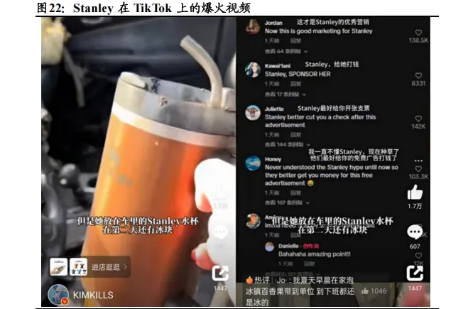Stanley 品牌爆火出圈源于 TikTok 上的营销事件。2023 年 11 月,一位女士上传了一个视频,视频内容是自己的汽车自燃后,放在杯架上的 Stanley 保温杯不仅完好无损,里面冰块甚至都没有化。这条视频引起广泛关注,播放量上亿,点赞达到 900 万,评论区大多数评论表示不可思议、有被这个广告安利。