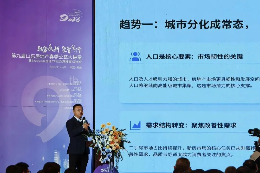 王院长从行业趋势、市场环境方面进行分析,当下山东房地产市场呈现深度分化、存量提质、需求转向三大特征,人口持续向高能级城市集聚,二手房占比不断提升,新房市场全面转向以改善需求为核心,“好城市 + 好房子” 成为行业确定性发展方向,城市更新进入系统性推进阶段,“十五五” 期间市场规模保持稳定,结构性机遇依然突出。
