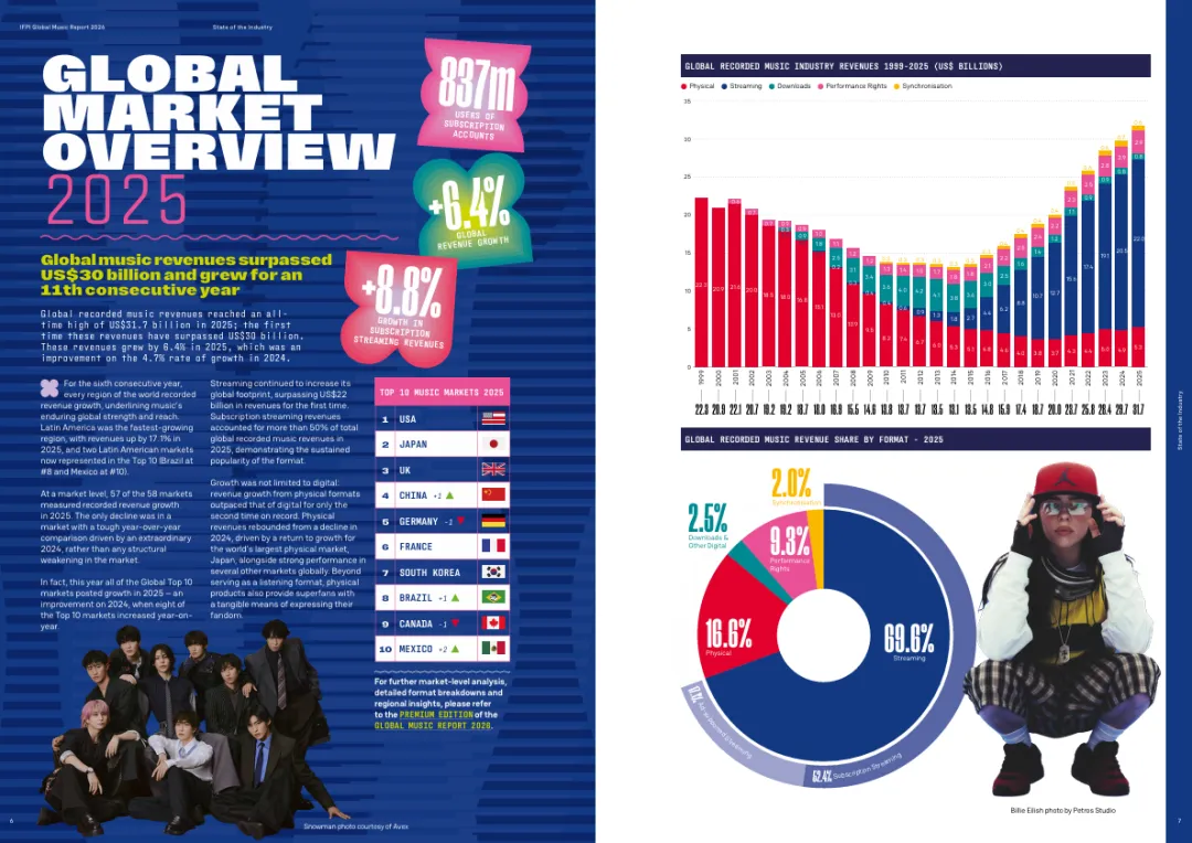 2025年是全球音乐产业的重要里程碑:收入首破300亿美元,连续11年增长,所有区域同步向好。流媒体依然是增长引擎,但实体格式的复苏表明,粉丝仍然珍视有形的音乐体验。