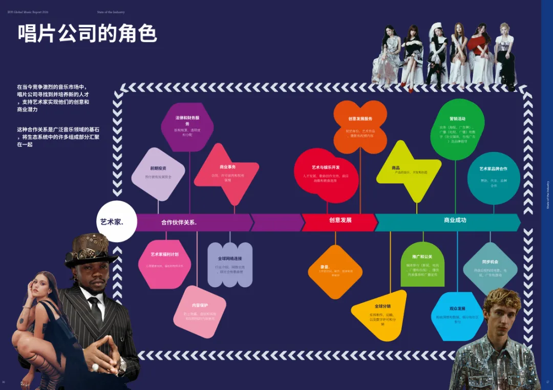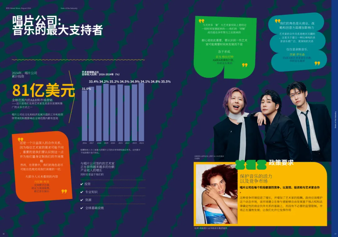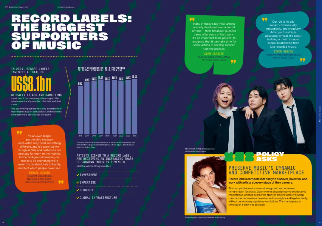 报告指出,唱片公司是艺人的主要投资者,2024年全球唱片公司在A&R和营销上的投资总计达81亿美元。唱片公司根据艺人不同发展阶段的需求,提供从创作支持、录音制作、粉丝互动到全球发行的全方位服务。索尼音乐娱乐全球数字业务总裁Dennis Koder表示:“每个艺人可能需要不同的东西,我们必须认识到这一点,并为他们定制市场策略。”