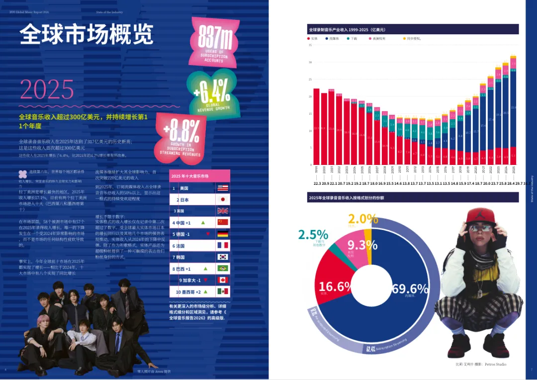 亚洲地区在2025年实现10.9%的双位数增长。日本作为全球第二大市场,在2025年恢复增长(+8.9%)。中国则超越德国,成为全球第四大音乐市场,全年收入增长20.1%,是全球前20大市场中增速最快的国家。