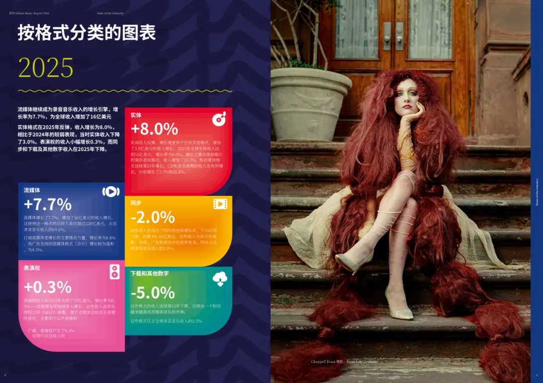 表演权收入在2025年达到29亿美元,同比增长0.3%,连续第五年增长。同步权收入则下滑至6.41亿美元,结束了连续四年的增长态势。下载及其他数字格式收入连续第13年下滑,仅占全球总收入的2.5%。