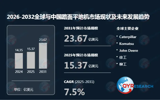 根据QYR(恒州博智)的统计及预测,2025年全球路面平地机市场销售额达到了15.37亿美元,预计2031年将达到23.67亿美元,年复合增长率(CAGR)为7.5%(2025-2031)。
