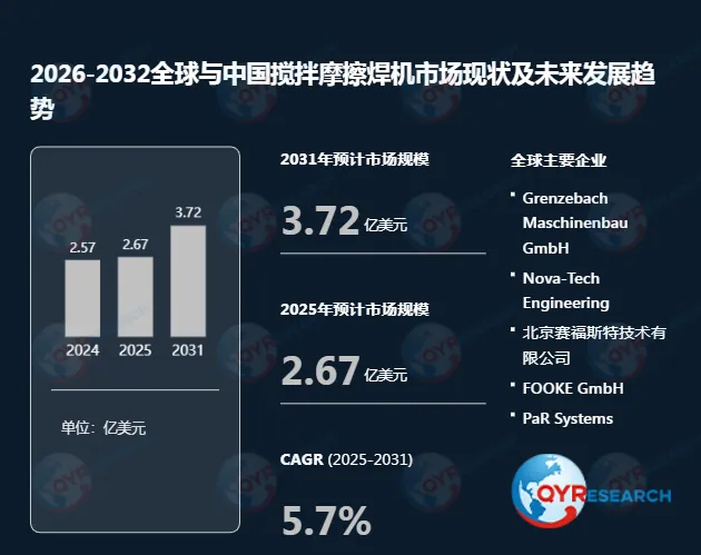 根据QYR(恒州博智)的统计及预测,2025年全球搅拌摩擦焊机市场销售额达到了2.67亿美元,预计2031年将达到3.72亿美元,年复合增长率(CAGR)为5.7%(2025-2031)。