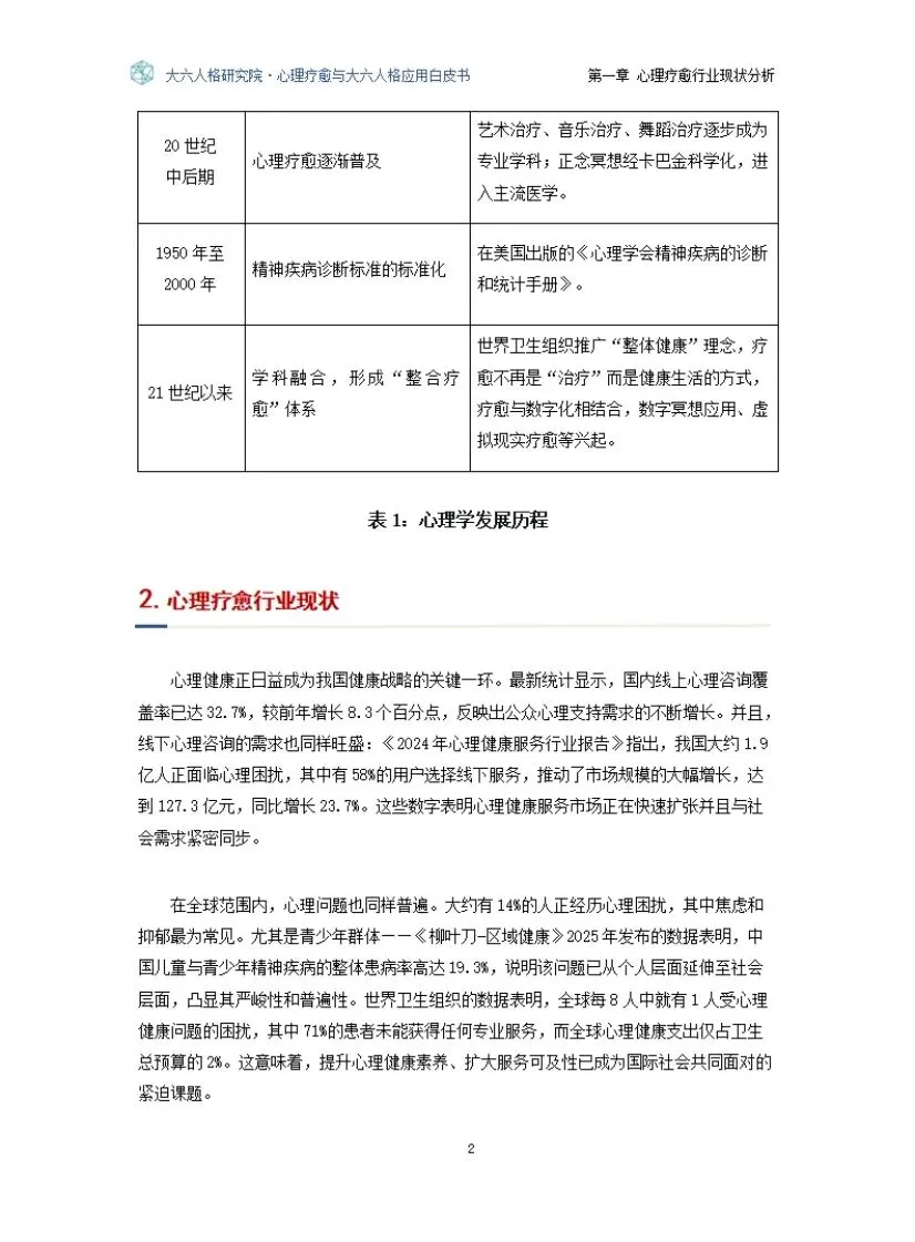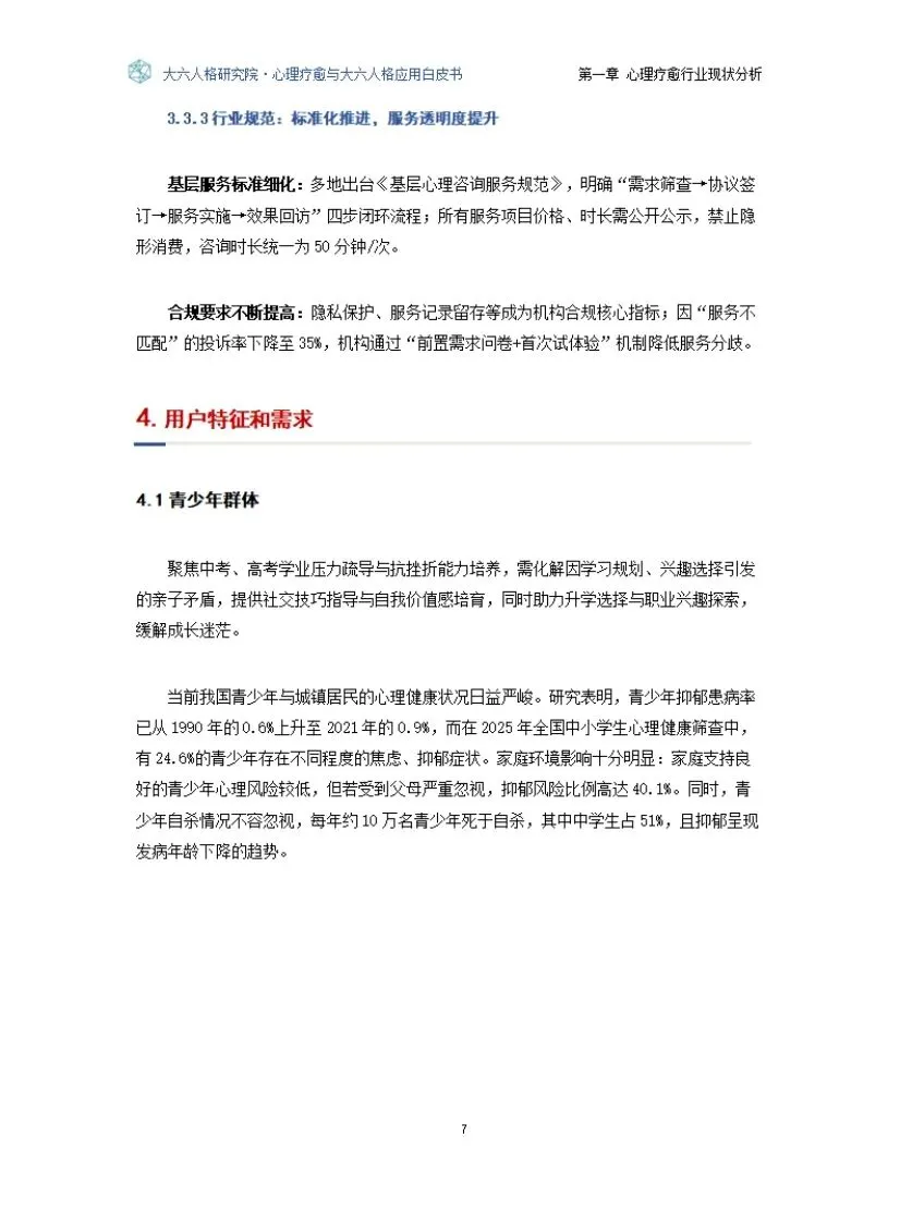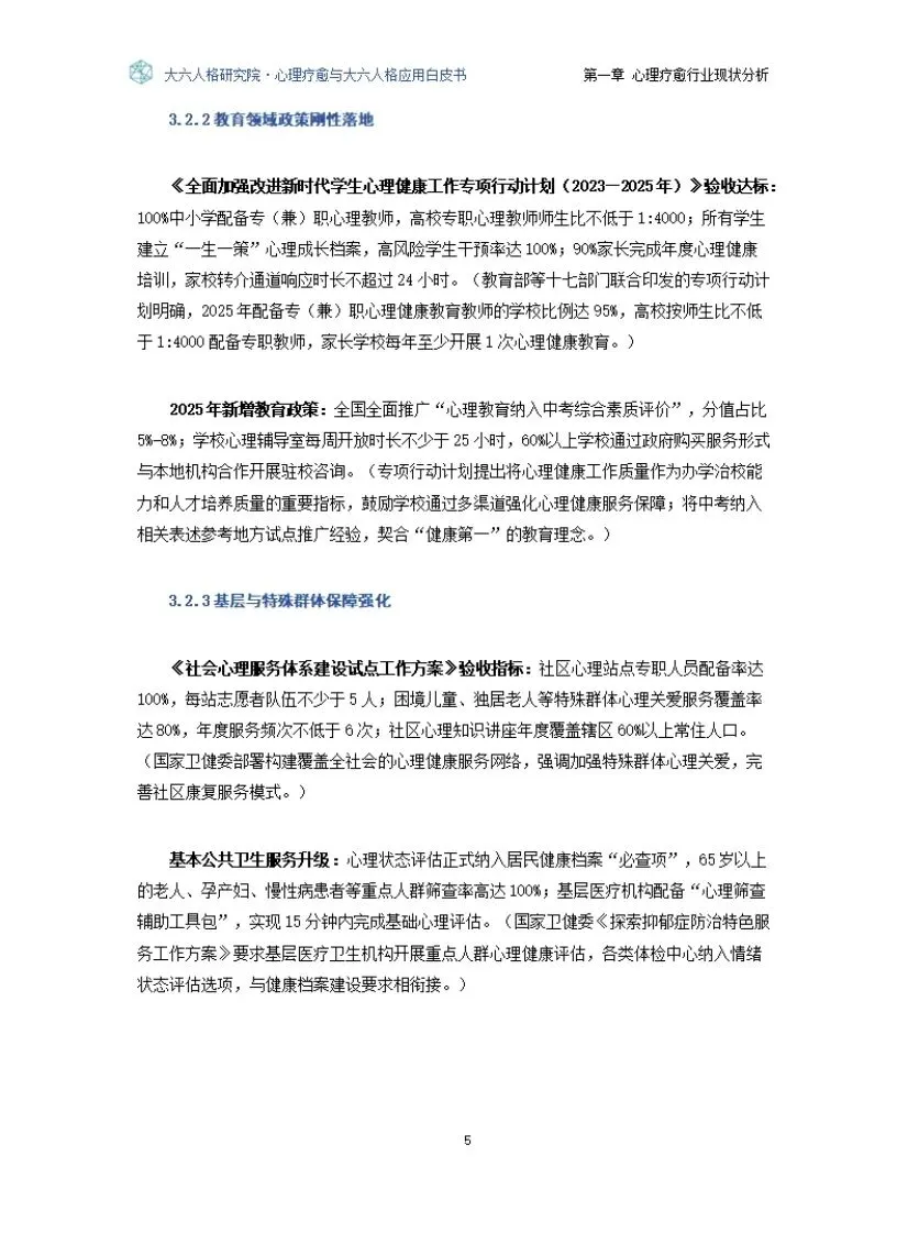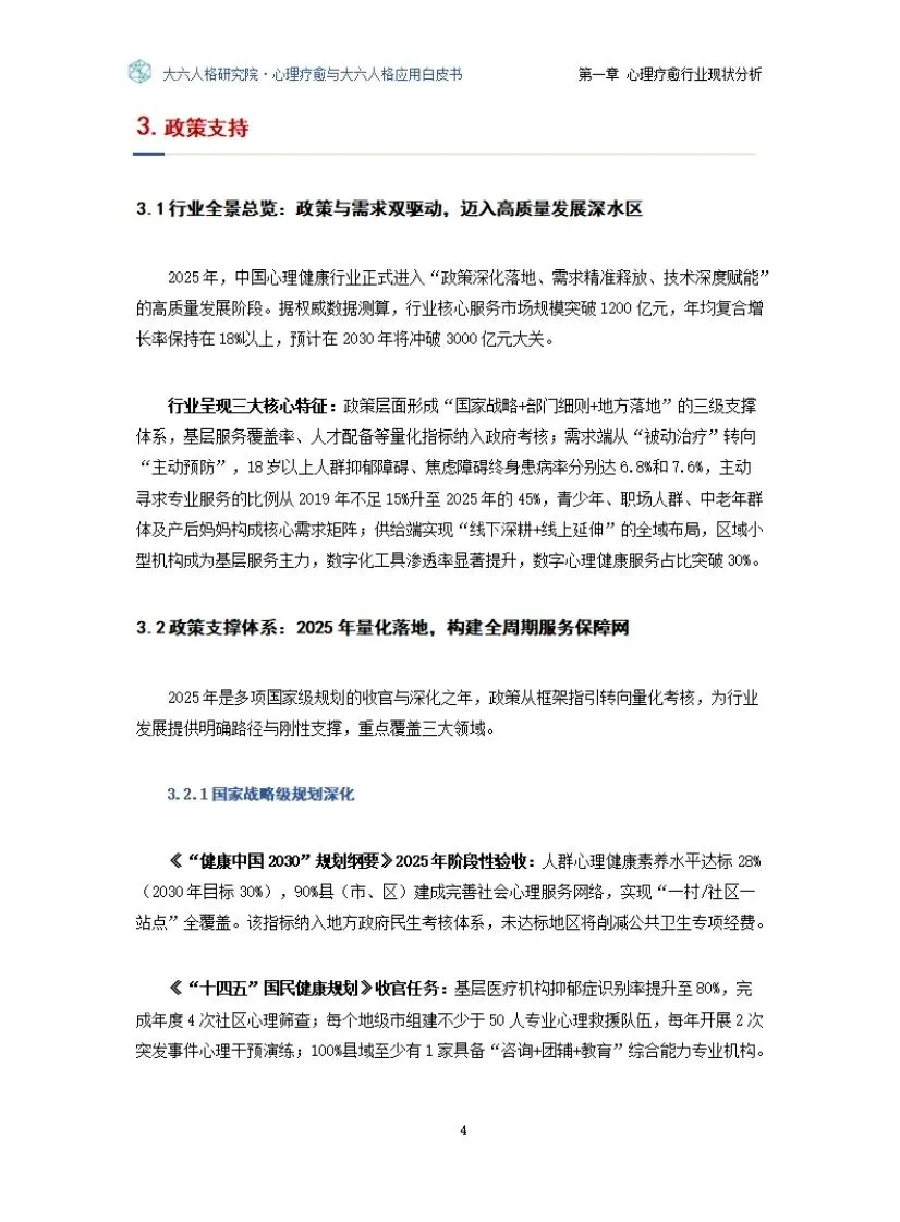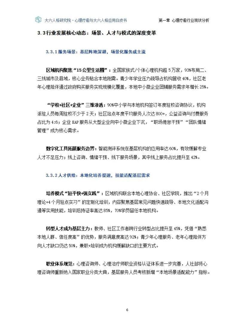 心理健康需求爆发,但专业服务跟不上?这份报告说,破局关键在“人格”一份报告揭示:未来十年,谁能为14亿人提供“可复制、可负担、有效果”的心理支持,谁就掌握了这个千亿市场的钥匙。今天,我们不聊AI,不聊芯片,聊一个更贴近我们每个人的话题——心理健康。你是否感觉,身边讨论情绪压力、寻求心理咨询的朋友变多了?这不是错觉。一份来自大六人格研究院的最新白皮书,为我们清晰地勾勒出中国心理疗愈行业的现状、痛点与一个充满希望的未来。报告揭示了一个巨大的矛盾:一方面,我国有近2亿人面临心理困扰,青少年情绪问题日益严峻,职场人群压力山大;另一方面,专业的心理服务资源却极度短缺,每十万人拥有的精神科医生数量,远低于发达国家。当“需求大爆发”撞上“供给跟不上”,这个千亿级别的市场,路在何方?这份报告指出了一个明确的答案:标准化、可复制、易普及的心理服务技术。而其中,一个名为 “大六人格” 的本土化心理学体系,正展现出成为“破局关键”的潜力。今天,就让我们一起解读这份报告,看看它如何为我们描绘心理疗愈的未来。一、现状扫描:一个“高需求、高增长、高缺口”的市场报告开篇就摆出了一系列不容忽视的数据,揭示了中国心理健康市场的三个关键特征:1. 需求旺盛且持续增长:我国线上心理咨询覆盖率已达32.7%,并且仍在快速提升。约1.9亿人存在心理困扰,其中超过一半(58%)的人会选择线下咨询服务,推动市场规模在2024年达到127.3亿元,同比增长超过23%。 ◦ 青少年:已成为“高风险高需求人群”。全国中小学生心理健康筛查显示,24.6% 的青少年存在不同程度的焦虑、抑郁症状。家庭支持缺失会急剧放大风险,被严重忽视的青少年抑郁风险比例高达40.1%。 ◦ 职场人群:22-35岁是主力咨询人群,女性用户占比高达70%。职业竞争、工作压力与家庭角色的多重冲突是核心痛点。 ◦ 中老年与产后妈妈:孤独感、角色适应、产后情绪问题同样需要社会关注。3. 专业供给存在巨大缺口:这是最核心的瓶颈。我国每十万人仅有6.1名精神科医生,远低于美国的12.7人和日本的11.9人。传统的、“一对一”、长周期的心理咨询模式,在巨大的人口基数面前显得杯水车薪。简单来说:市场很大,需求很急,但能提供有效服务的“专业人手”严重不足。报告明确指出,行业亟需能够快速培养人才、标准化服务流程、并下沉到社区、学校、家庭等多元场景的解决方案。二、政策东风:心理健康已成国家战略,服务下沉势在必行政策是行业的强力助推器。报告详细梳理了2025年的政策环境,显示心理健康已深度融入国家健康战略,并进入量化考核、刚性落地的阶段。• “健康中国2030” 要求到2025年,90%的县区建成社会心理服务网络,并纳入政府考核。• 教育领域,要求100%中小学配备专兼职心理教师,并为所有学生建立心理成长档案。• 基层服务,心理状态评估被纳入居民健康档案“必查项”。这意味着,心理服务不再是可选项,而将成为学校、社区、医疗机构必须提供的公共服务。政策驱动下,市场对能快速普及、易操作、效果可评估的“心理服务工具”的需求将呈指数级增长。三、破局关键:“大六人格”是什么?为何能成为解决方案?正是在这样的行业背景下,报告隆重介绍了 “大六人格”体系。它不是一个简单的性格测试,而是一套根植于本土文化、系统化、可操作的人格心理理论与应用技术。更深入的是其 “人格剧本”理论。报告指出,每个人在童年关键期(0-18岁,每3年一个阶段)如果某种“精神能量”缺失,就会形成相应的人格模式,并在成年后不断重复特定的情绪和行为困局。例如:• 0-2岁缺乏安全感,可能形成“敏感我”剧本,易陷入内耗。• 6-8岁被过度苛责,可能形成“完美我”剧本,变得自我挑剔。这正是“大六人格”应对行业痛点的答案。报告强调,它的核心优势在于:• 易学易懂:六大原型特征鲜明,让非专业人士(家长、老师、社区工作者)也能快速理解并应用,实现心理知识的“降维普及”。• 标准化评估与干预:提供了清晰的框架,能将复杂的心理问题转化为“可识别、可训练、可追踪”的标准化方案,大幅降低了服务对咨询师个人经验的依赖。• 快速培养人才:依托这套体系,可以构建“短平快+强实践”的培训模式,批量培养能解决实际问题的心理服务人员,快速补充基层人力。报告展示了“大六人格”技术如何融入各种疗愈方法和生活场景,实现“精准匹配”。 ◦ 艺术疗愈:快乐我适合绘画释放创意,敏感我适合音乐安抚情绪。 ◦ 自然疗愈:和谐我适合植物疗愈获得平静,现实我可通过园艺培养责任感。 ◦ 身体疗愈:完美我适合瑜伽进行内在觉察,快乐我可通过舞动释放压力。 从青少年心理辅导、亲子教育、婚恋关系,到职场压力、个人成长、情绪管理,乃至企业EAP(员工心理援助)和心理咨询师培训,报告列出了详细的应用对应表,显示了其极强的普适性和实用性。1. 把个性化变成可复制:用六大原型快速定位核心心理需求,将个性化服务流程化。2. 把服务从咨询室带到生活场景:进入学校、家庭、社区,成为日常可用的心理支持工具。3. 构建“成长系统”而非“问题修复”:其终极目标不是仅仅缓解焦虑、抑郁等症状,而是通过“能量补全”和“剧本升级”,帮助个体实现人格的终身成长与觉醒,收获稳定的情绪、