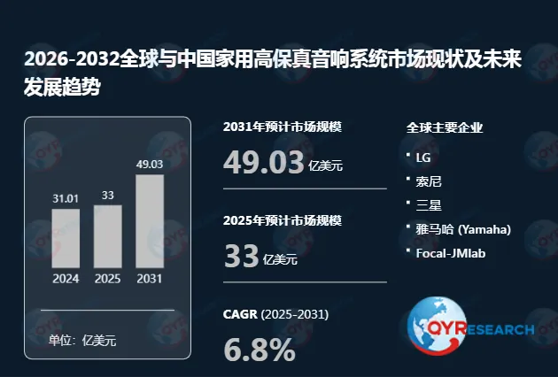 根据QYR(恒州博智)的统计及预测,2025年全球家用高保真音响系统市场销售额达到了33.00亿美元,预计2031年将达到49.03亿美元,年复合增长率(CAGR)为6.8%(2025-2031)。