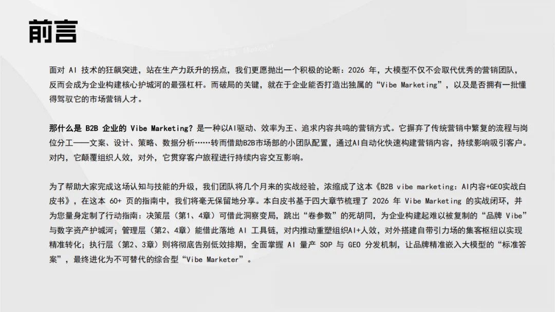 《B2B Vibe Marketing:AI内容+GEO实战白皮书》不仅仅是一份技术指南,更是一份面向未来的生存宣言。它告诉我们,AI时代的营销竞争,不再是人力与时间的堆砌,而是认知维度与组织效率的降维打击。