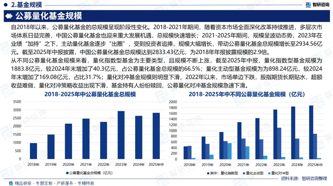 整体规模:2018-2021年期间,随着资本市场全面深化改革持续推进,多层次市场体系日益完善,中国公募量化基金也迎来重大发展机遇,总规模快速增长;2021-2025年期间,规模呈波动态势,2023年在业绩“加持”之下,主动量化基金逐步“出圈”,受到投资者追捧,规模大幅增长,带动公募量化基金总规模增长至2934.56亿元。截至2025年中报披露,中国公募量化基金总规模达到2833.43亿元,为2018年年报披露规模的2.9倍。