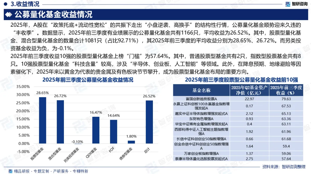 中国公募量化基金于2002年开始起步,伴随着中国资本市场的逐步开放与制度完善,量化投资开始在国内萌芽。历经二十余年的发展,公募量化基金已从边缘小众产品成长为公募基金行业的重要组成部分,形成了指数增强、量化对冲、主动量化等多元策略格局。2025年A股市场在“科技突围”与“反内卷”政策的主线交织下走出了一场波澜壮阔的结构性行情,小盘成长风格持续占优,成交活跃度显著提升,量化基金迎来业绩与规模的“双丰收”。截至10月29日,2025年期间公募量化策略基金合计成立158只,比2024年全年的95只增逾66%,并创出历年来年度新高,其中增强指数型基金新成立132只。从发行规模来看,量化策略基金年内募资总规模为830.64亿元,超出了历史上任何一个年份,比2024年的368.55亿元增长125%。自2018年以来,公募量化基金的总规模呈现阶段性变化。2018-2021年期间,随着资本市场全面深化改革持续推进,多层次市场体系日益完善,中国公募量化基金也迎来重大发展机遇,总规模快速增长;2021-2025年期间,规模呈波动态势,2023年在业绩“加持”之下,主动量化基金逐步“出圈”,受到投资者追捧,规模大幅增长,带动公募量化基金总规模增长至2934.56亿元。截至2025年中报披露,中国公募量化基金总规模达到2833.43亿元。从不同公募量化基金规模来看,量化指数型基金为主要类型,且规模不断上涨,截至2025年中报,量化指数型基金规模为1883.8亿元,较2024年末增加了40.3亿元,占公募量化基金总规模的66.5%;量化主动型基金规模为为898.24亿元,较2024年末增加了169.08亿元,占比31.7%。2025年,A股在“政策托底+流动性宽松”的共振下走出“小盘逆袭、高换手”的结构性行情,公募量化基金顺势迎来久违的“丰收季”。数据显示,2025年前三季度有业绩展示的公募量化基金共有1166只,平均收益为26.52%。其中,股票型量化基金、混合型量化基金的数量合计1081只(占比92.71%),其2025年前三季度的平均收益分别为28.65%、26.72%。而另类投资基金收益为负,为-0.1%。