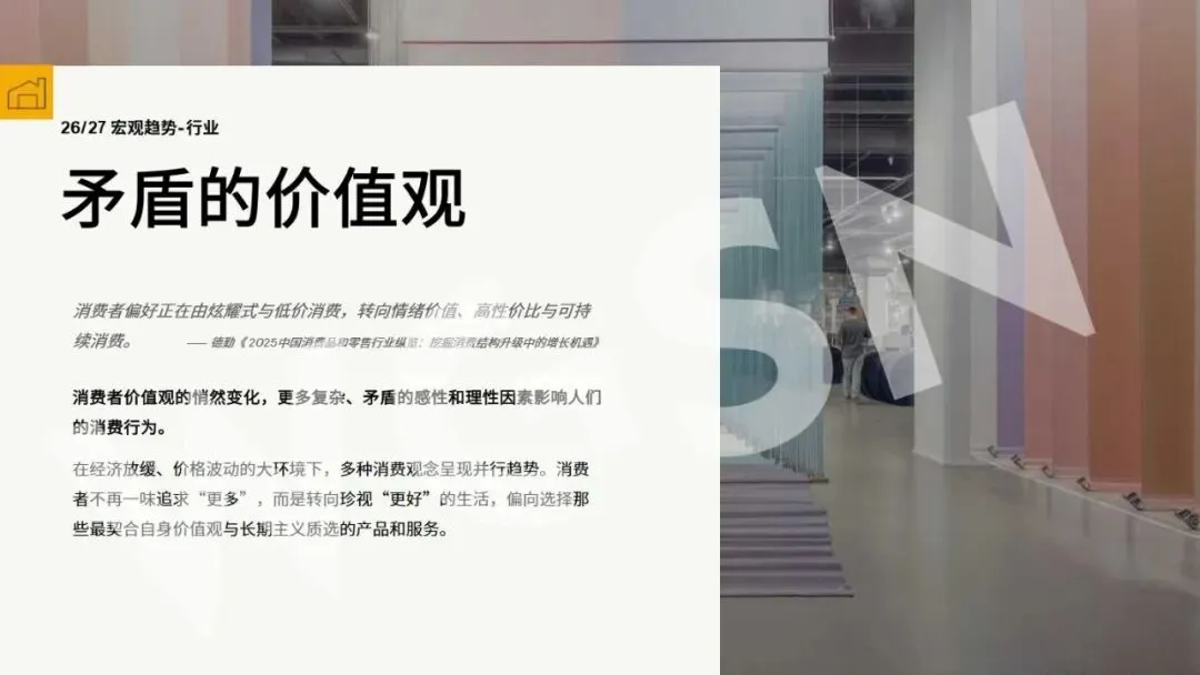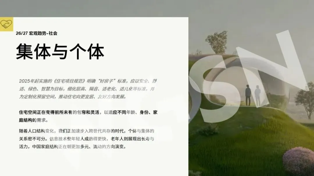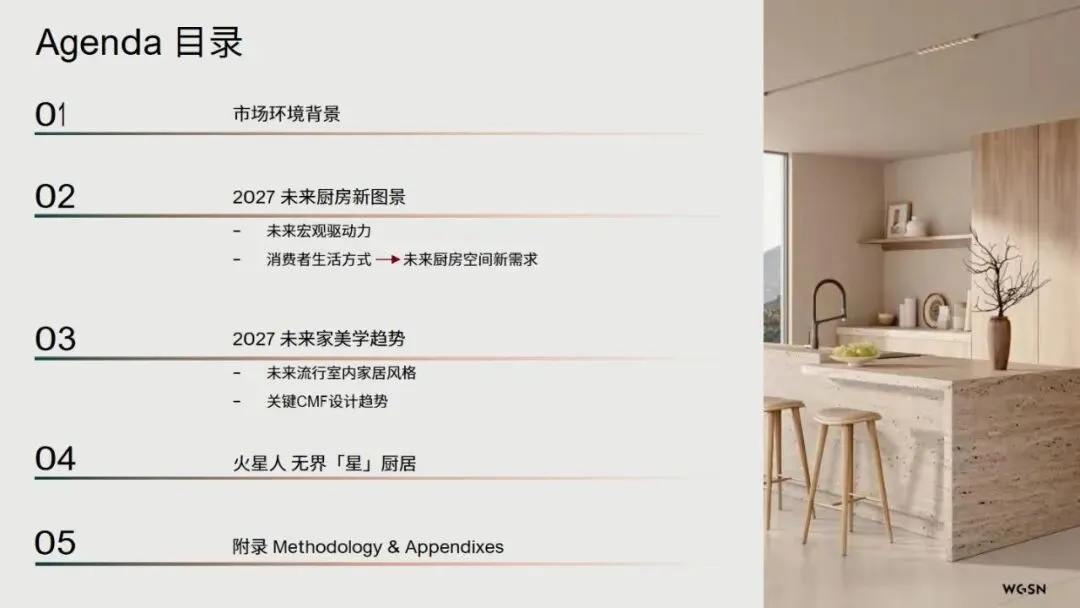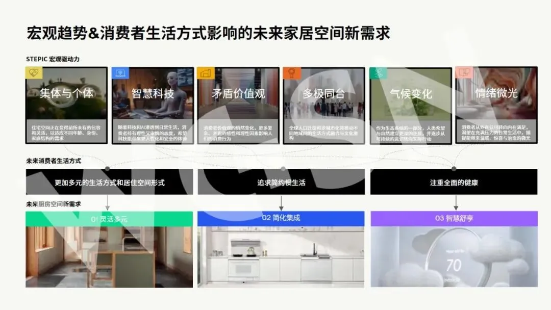 当下家居空间的功能与美学正迎来重构,厨房不再是单一的烹饪场所,其在家庭生活中的价值与定位发生核心转变,生活重心的“回流”让厨房逐步成为家的“第二客厅”。这里既承载着亲友围聚的互动场景,也容纳着个人独处的闲适时光,从团圆围炉的温馨,到日常与萌宠相伴的慵懒,多元生活形态在此交融。集成厨居的发展消解了厨房物理空间的拥挤感,让空间变得开阔通透,为人们安放喜好、营造自我生活节奏提供了更多可能。同时,2027+家居风格与CMF趋势也为厨房空间设计赋予新的方向,静谧舒适、低调奢华的美学主张,与厨房的功能升级相融合,界定了人们对厨房空间的全新生活向往。厨房空间的美学重构,本质是让空间回归生活本身,以功能与美学的双重升级,适配当代人多元的生活需求。