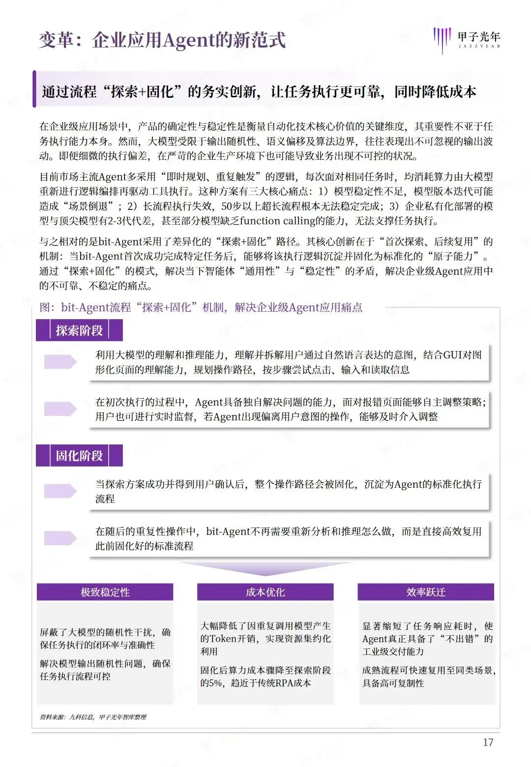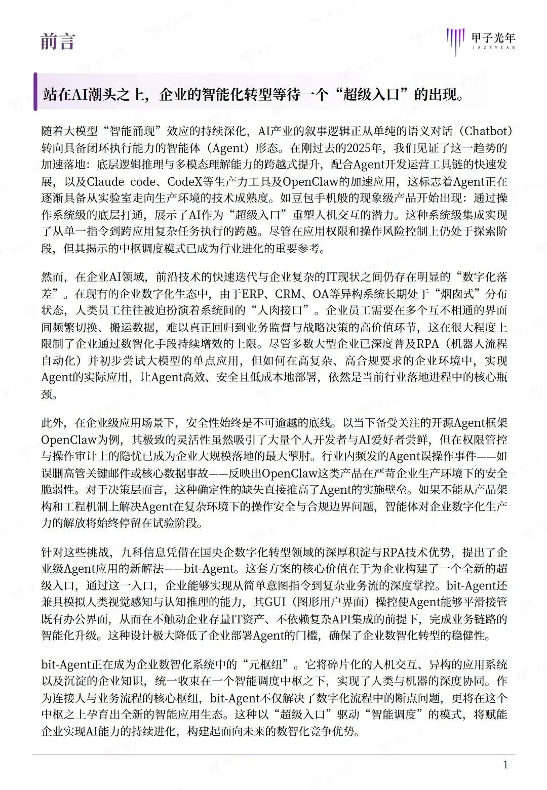 当前企业数智化转型进入深水区,Agent技术成为推动人工智能应用变革的核心方向,正从单点交互向自主代理范式升级,为企业自动化向智能化跨越提供新路径。但企业级Agent落地仍面临多重瓶颈,开源框架虽实现技术打样,却存在权限管控、操作审计等安全隐患,同时企业还面临系统集成难、数据孤岛、交互适配不足等问题,叠加大模型输出随机性带来的执行不确定性,严重制约Agent在高合规、高复杂企业环境中的规模化部署。在此背景下,企业亟需构建兼具安全性、兼容性与智能调度能力的统一智能中枢,破解集成缺口与落地壁垒。本报告立足企业AI转型实际需求,梳理Agent技术发展趋势与企业应用痛点,剖析企业级Agent的核心能力要求,并结合九科信息bit-Agent的实践案例,探讨企业级Agent的技术实现路径、落地方法论与未来发展方向,为企业实现Agent技术的安全、高效落地提供参考。