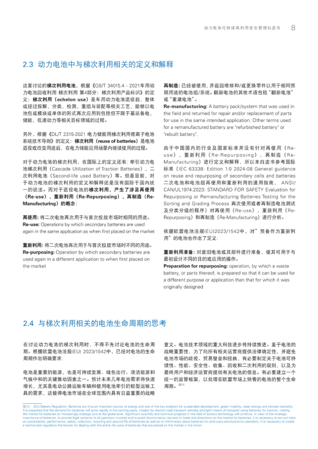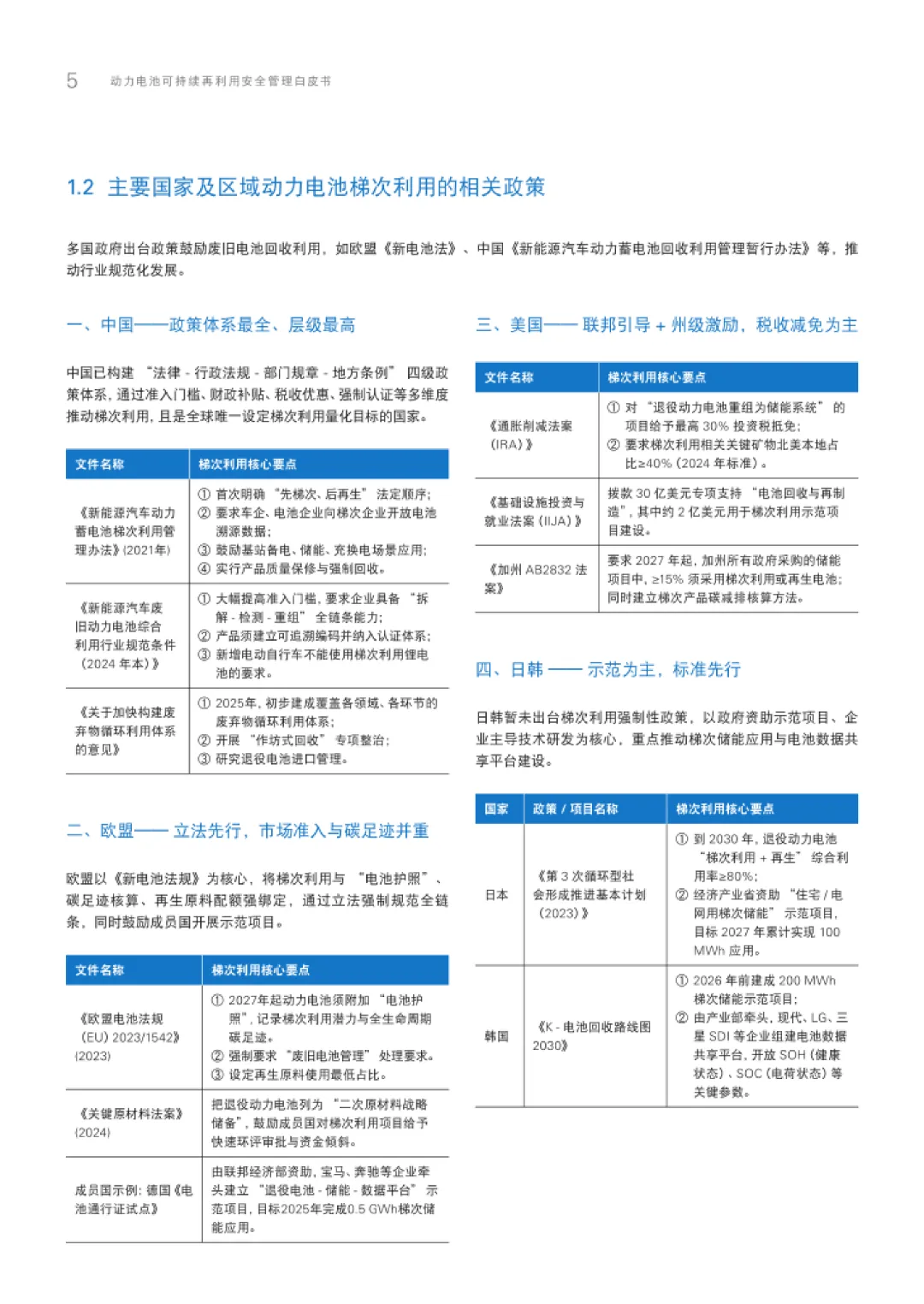 白皮书首先剖析了全球动力电池梯次利用的市场现状与政策环境。亚太地区作为最大市场,中国因新能源汽车保有量领先即将迎来退役潮,2030年退役规模预计达1483GWh。各国政策纷纷加码,欧盟通过《新电池法规》引入再使用、重新利用、再制造定义,中国则构建“法律-行政法规-部门规章-地方条例”四级政策体系,明确“先梯次、后再生”原则,推动行业规范化发展。