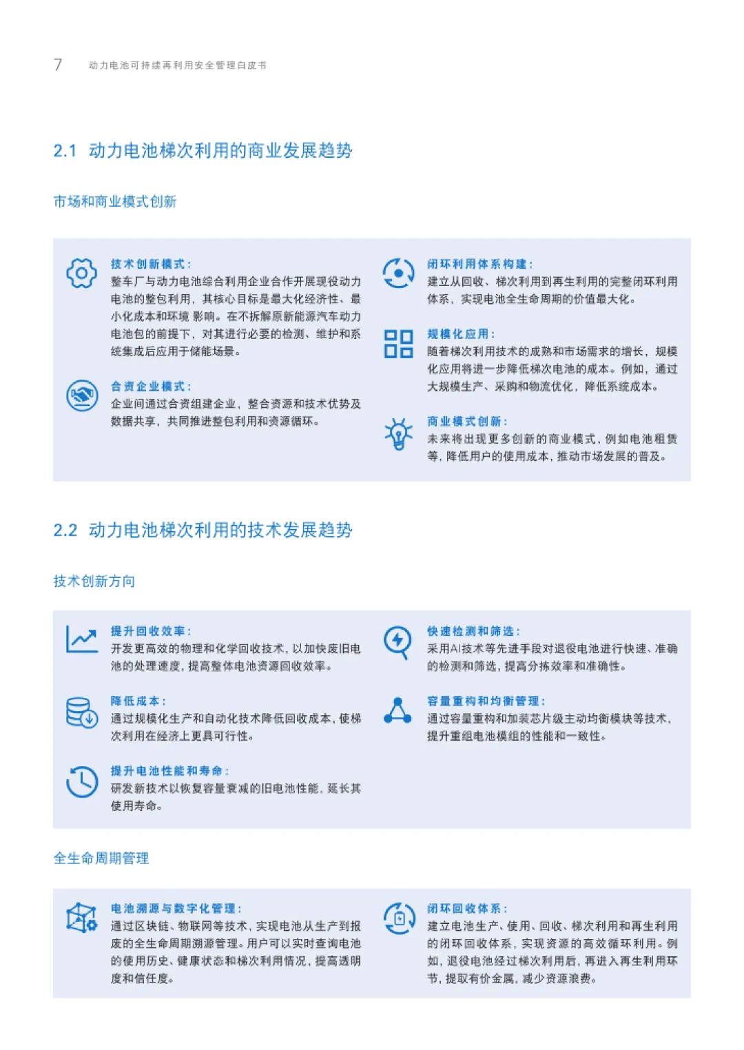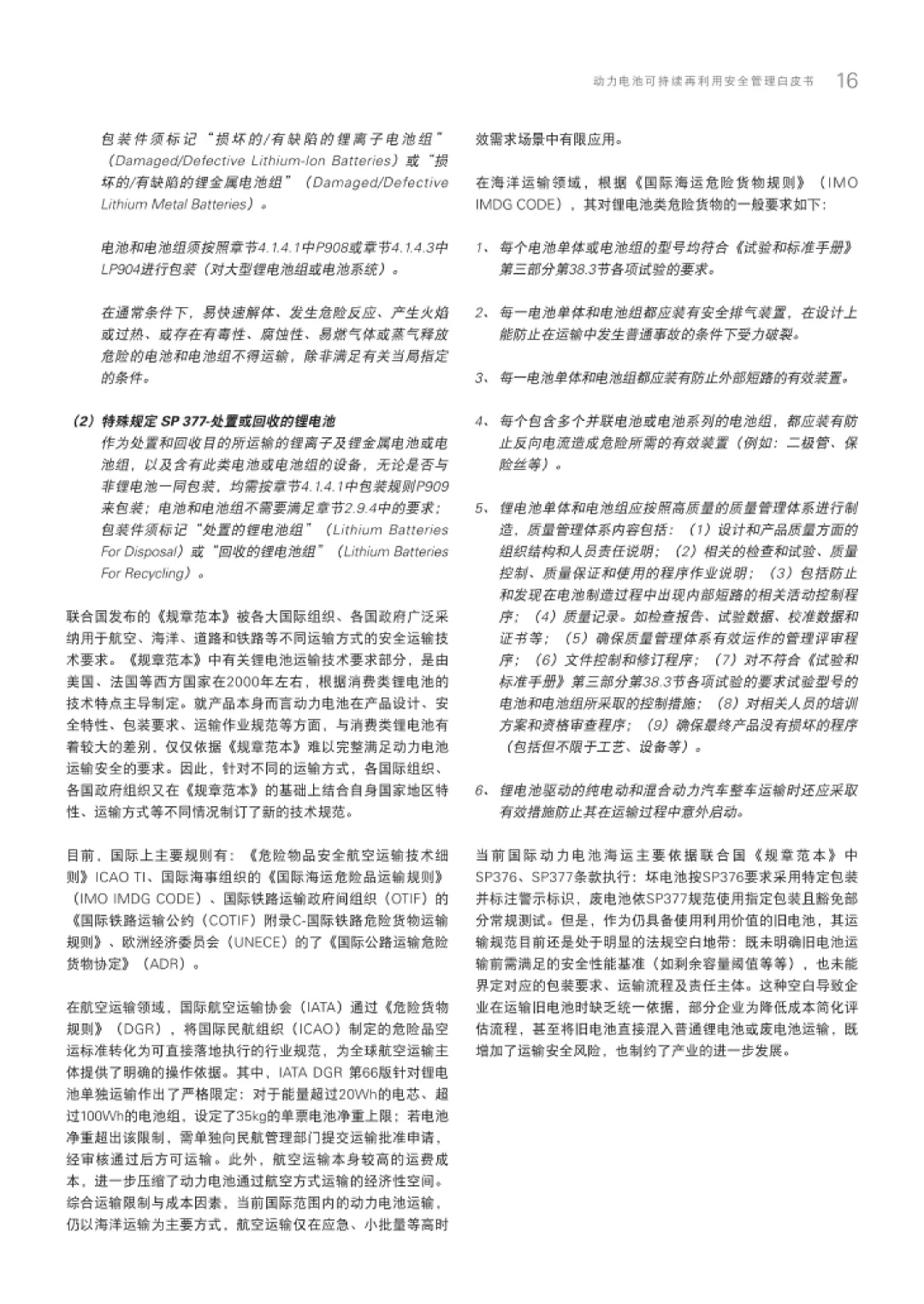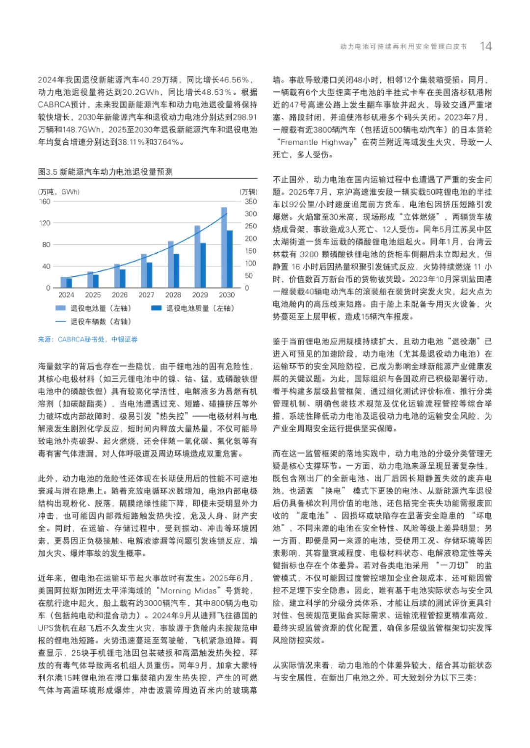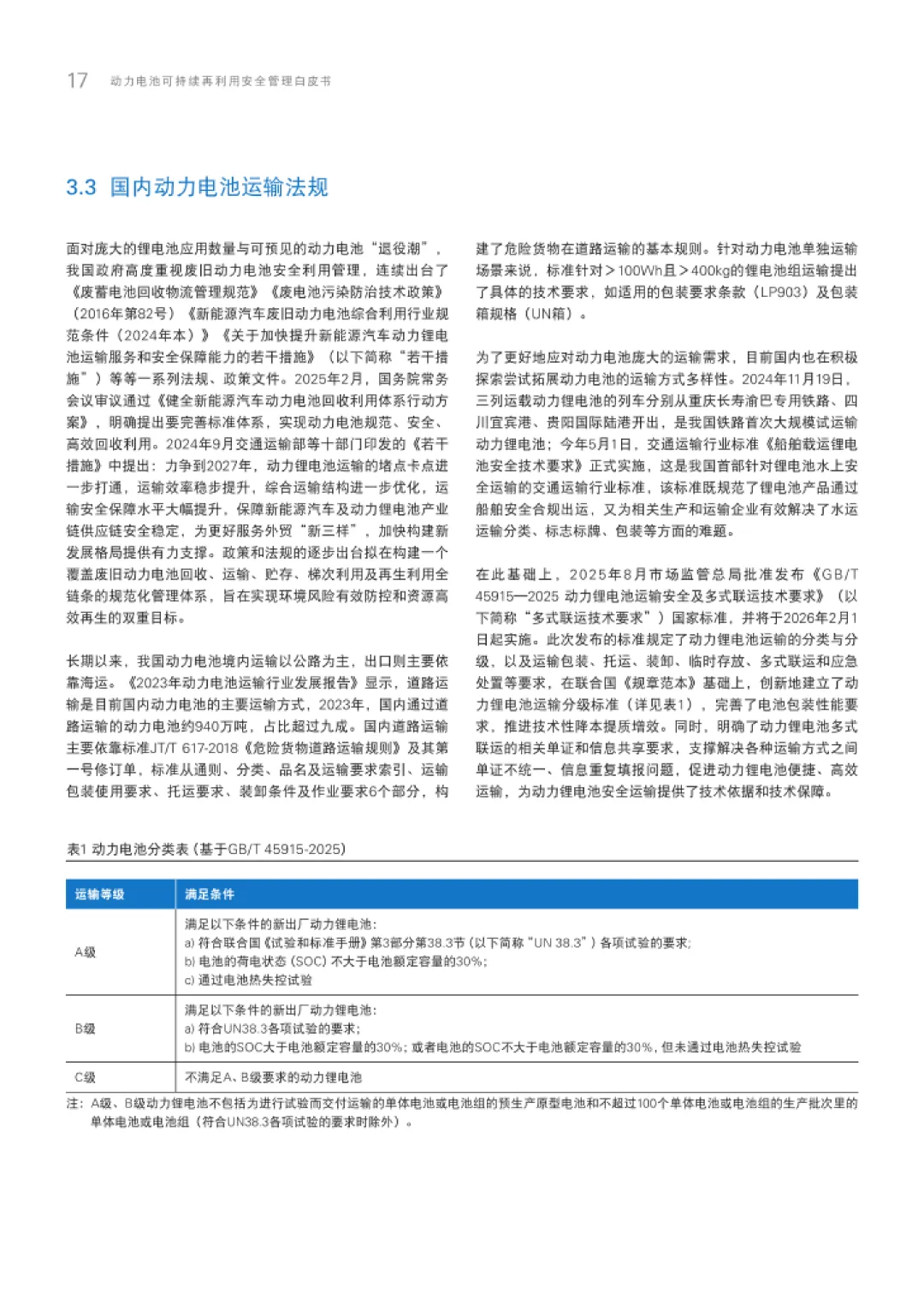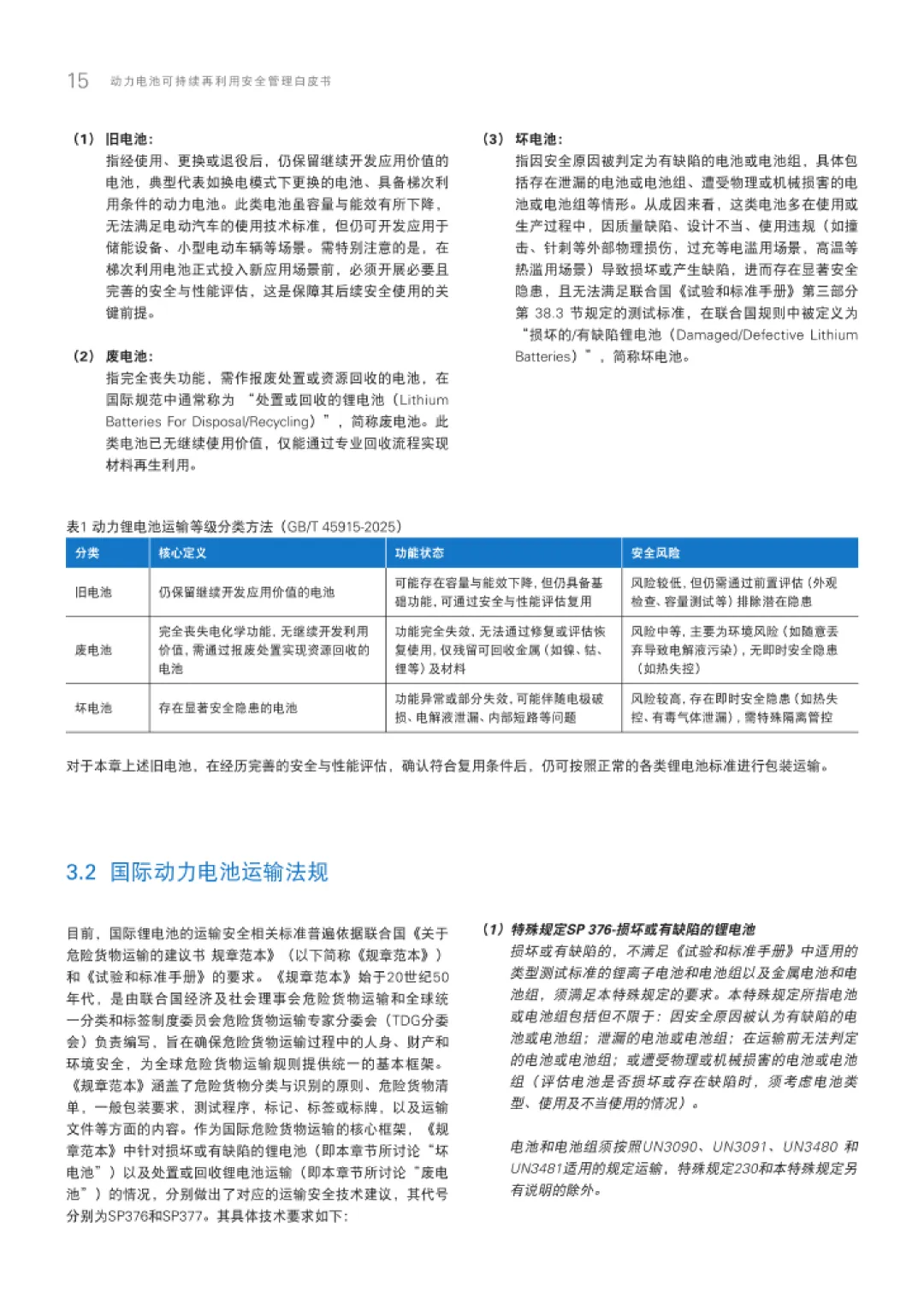 在技术与标准层面,白皮书聚焦梯次利用的核心挑战与创新方向。技术上,强调提升电池健康状态评估精度、延长二次使用周期、保障安全性能,通过AI快速检测、容量重构、主动均衡等技术降低成本。标准方面,参考国际IEC 63338、UL 1974等标准,建立旧电池、废电池、坏电池三级分类体系,规范运输安全要求,如联合国《规章范本》中的SP 376和SP 377条款,以及国内GB/T 45915-2025的分级运输标准。