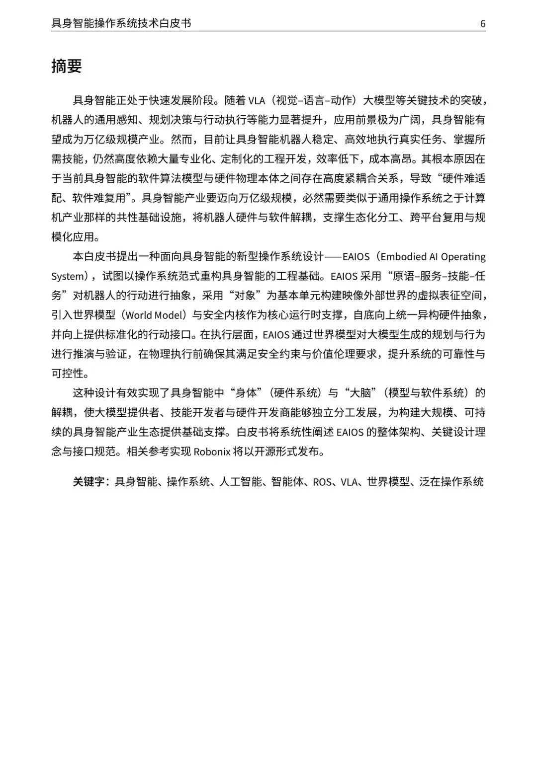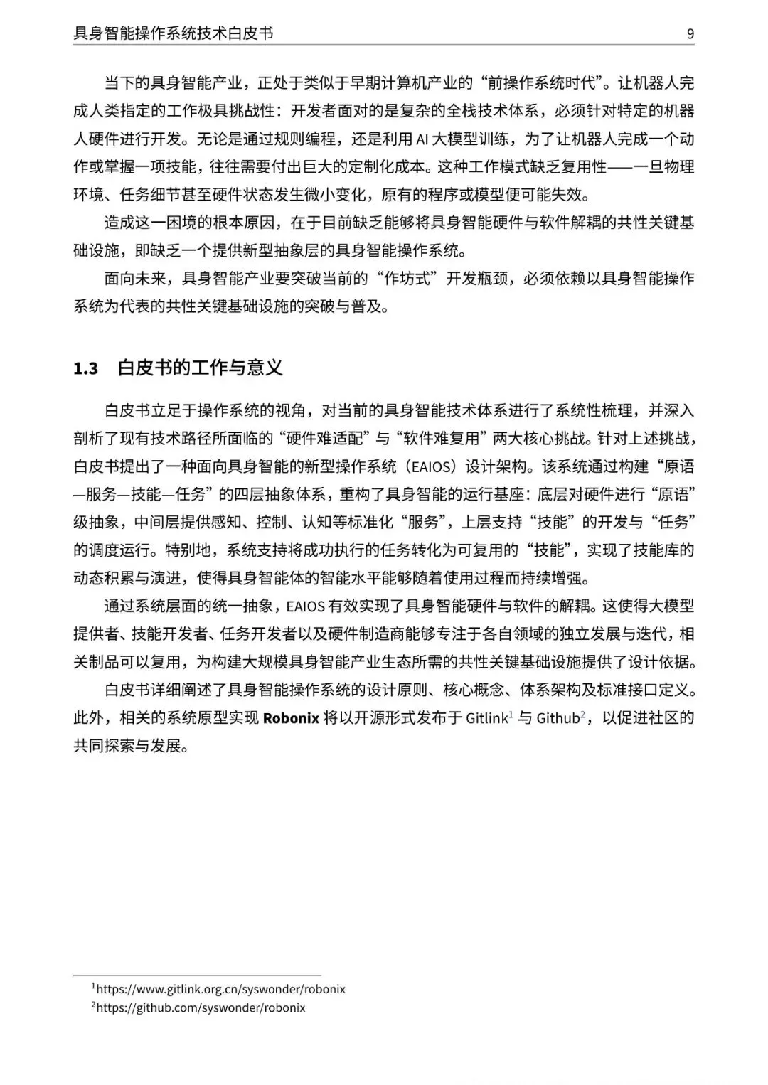 白皮书从当前具身智能产业的发展现状出发,系统梳理并分析了当前具身智能软件系统开发中的若干问题,提出了一种面向具身智能的新型操作系统设计,旨在以操作系统范式重构具身智能的工程基础,并为构建大规模、可持续的具身智能产业生态提供支撑。