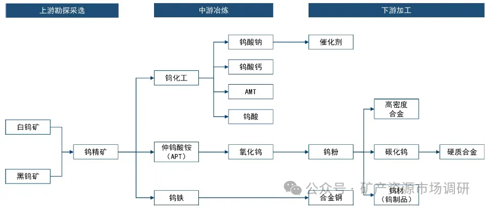 钨产业链从钨矿的勘探采选、冶炼,延伸到钨的深加工,最终应用于泛工业领域。钨行业上游以黑白钨矿勘探采选为主,中游主要是"钨精矿-仲钨酸铵(APT)-钨粉"冶炼,下游包括钨材、钨丝、硬质合金等材料加工,而更下级的需求主体包括机