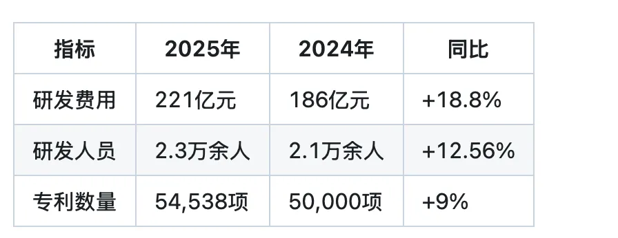 研发优势:2.3万名研发人员,54,538项专利(2024年为43,354项,境外专利17,915项)