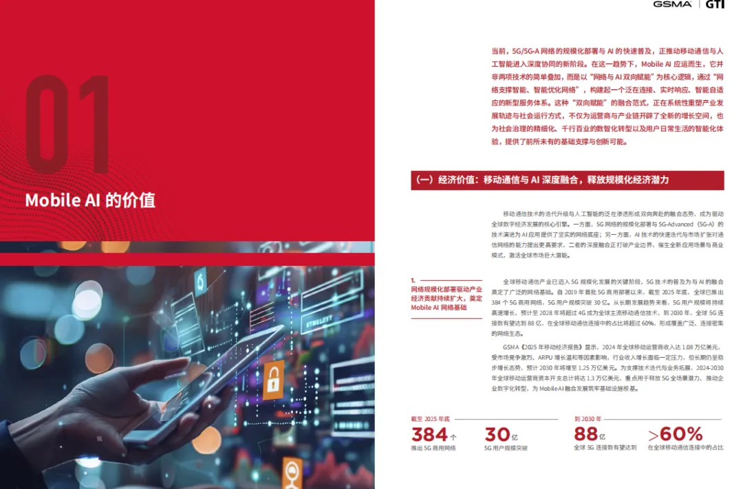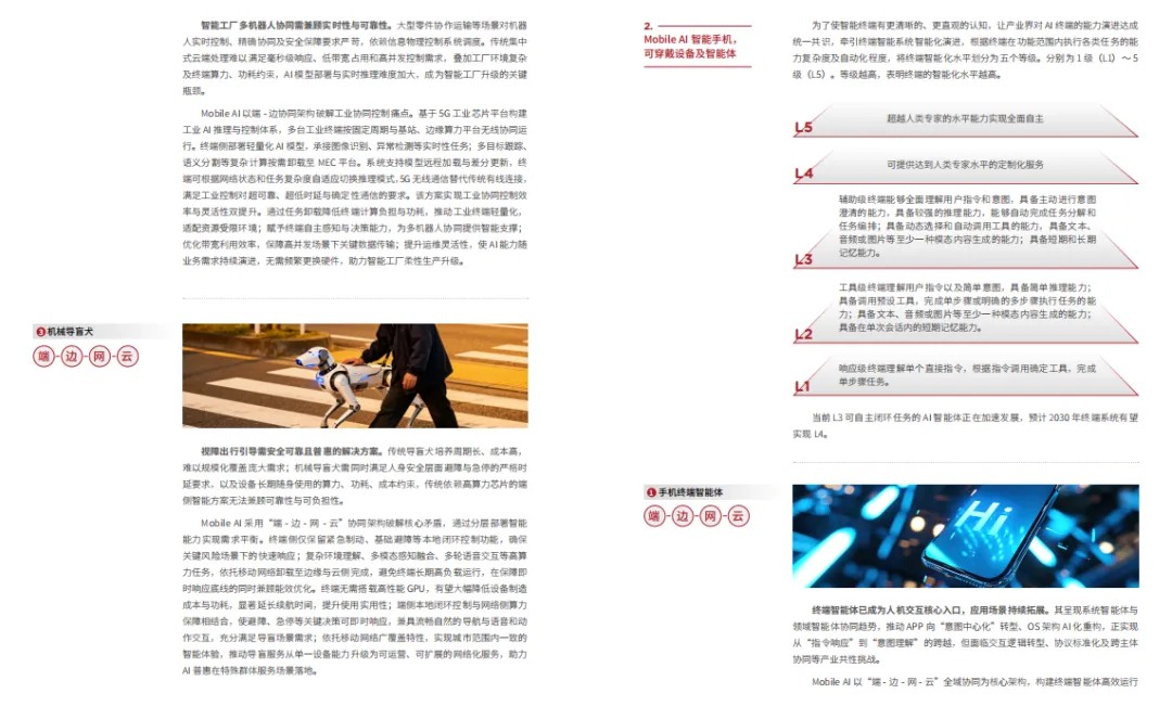 报告开篇指出,随着5G规模化部署成熟、5G-A技术落地及6G前瞻布局,移动通信与人工智能(AI)的深度融合已成为必然趋势,共同开启了一个全新的“移动AI时代”。报告明确定义,Mobile AI是以“网络与AI双向赋能”为核心逻辑,依托5G/5G-A/6G等先进移动通信网络的泛在连接、低时延、高可靠特性,结合AI的智能感知与决策能力,通过“端-边-网-云”全域协同,构建的智能服务体系。 其核心目标是“让AI无所不在,且可信好用”。