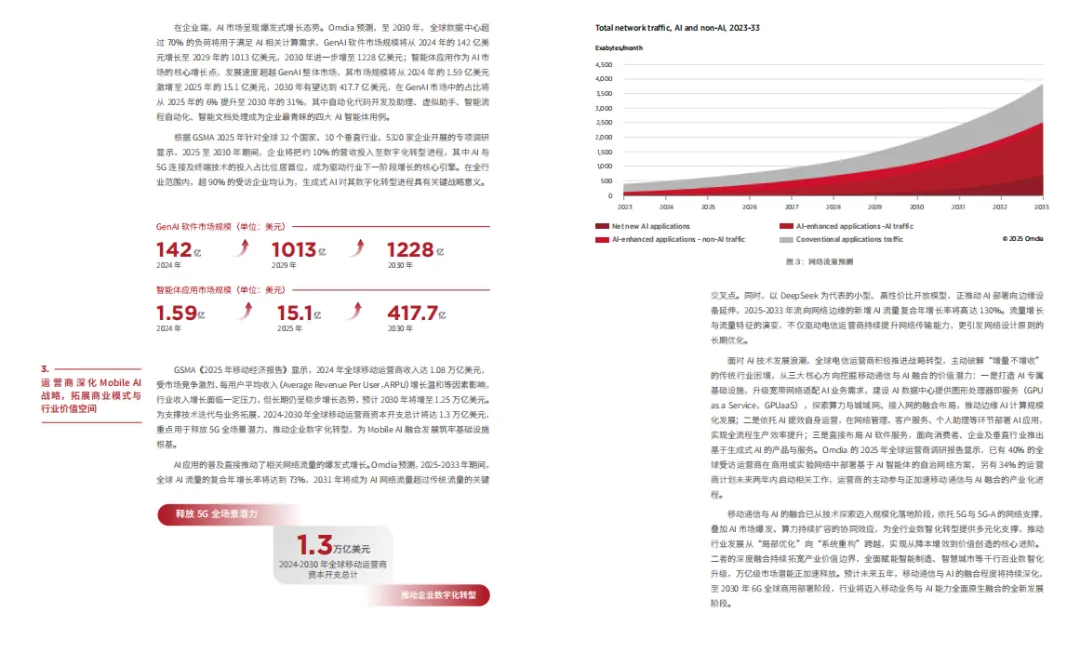 为实现Mobile AI的规模化落地,报告提出了五大实现路径:设施增强(升级网络与算力基础)、频谱保障(规划与优化频谱资源)、技术创新(发展内生AI网络架构等关键技术)、终端变革(推动硬件升级与产业协同)以及标准构建(建立统一的技术与应用规范)。