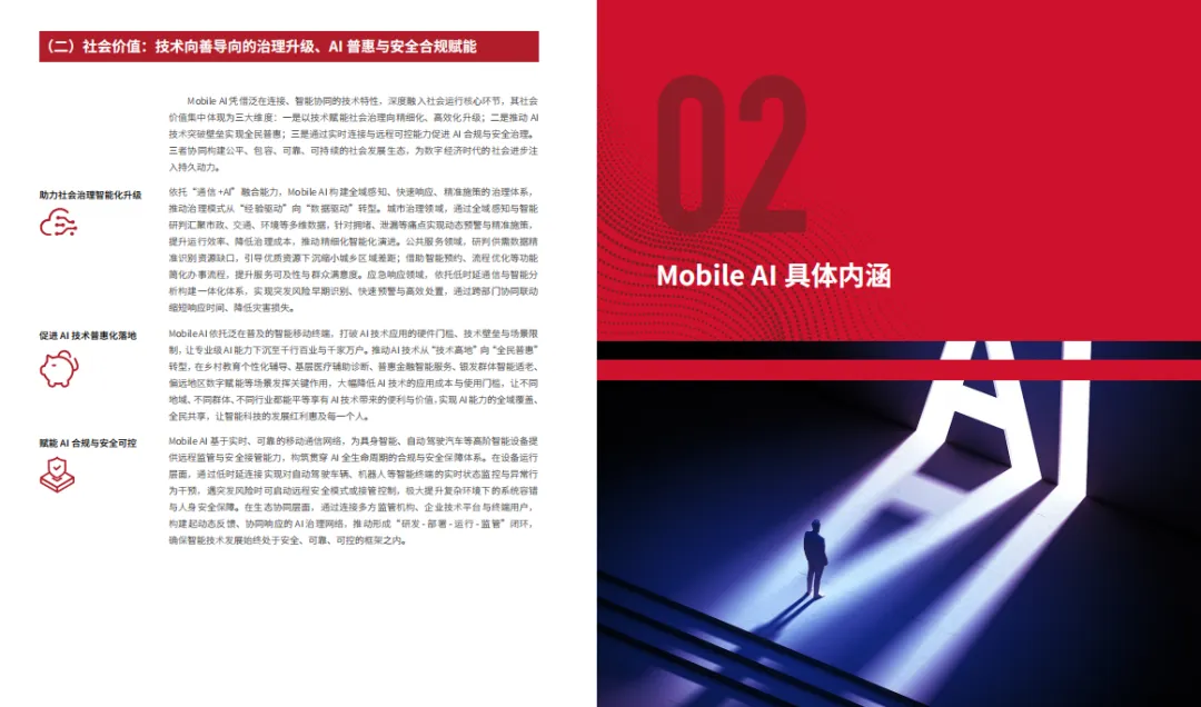 白皮书详细探讨了Mobile AI带来的经济价值与社会价值。经济上,它通过释放5G/6G网络规模经济潜力、驱动AI市场爆发与深度融合,为运营商和全产业链开辟了全新的增长空间。社会上,它能助力社会治理智能化升级、促进AI技术普惠化落地,并赋能AI的合规与安全可控。