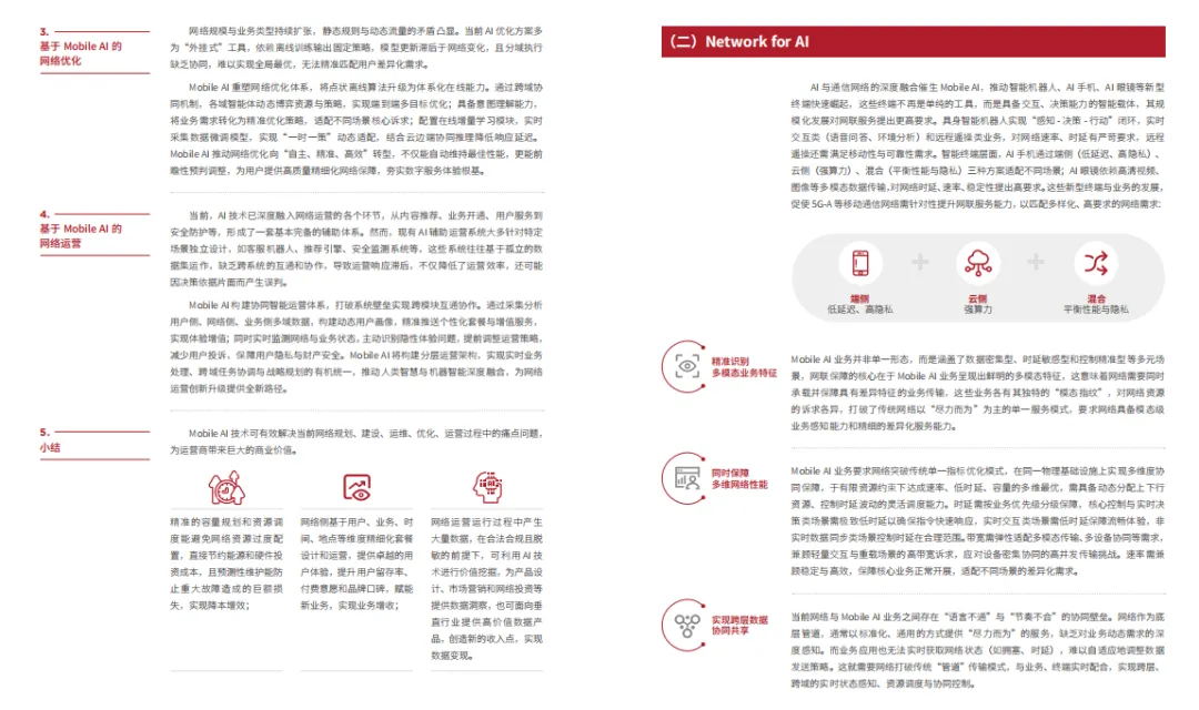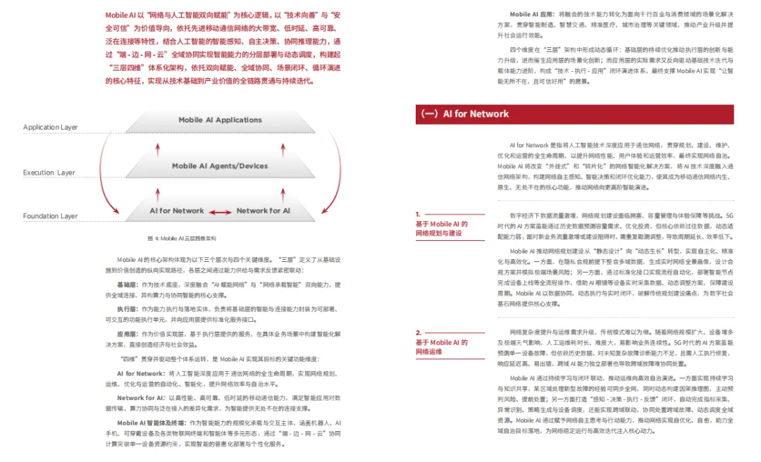 四维:是驱动体系运转的四个关键功能维度,即AI for Network(用AI智能化网络运维与优化)、Network for AI(用高性能网络支撑AI应用需求)、Mobile AI智能体及终端(如机器人、AI手机等智能载体)以及Mobile AI应用(面向消费与行业的场景化方案)。