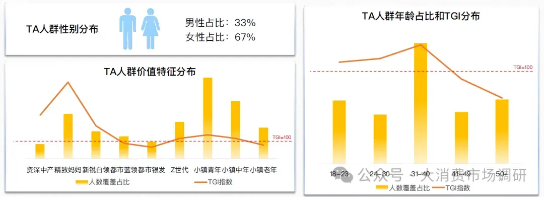 在性别分布上,女性用户占比超过2/3;年龄方面,18-40岁TG数值均高于100,其中31-40岁年龄层人群占比较高,为膨化食品内容消费主力人群;价值特征方面,精致妈妈TGI数值远高于其他。
