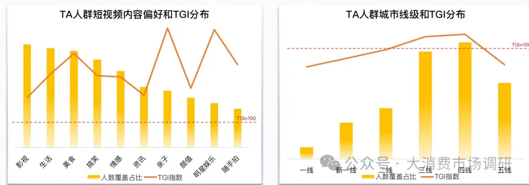 TA人群内容偏好占比均在84%以上,对影视、生活、美食内容有兴趣偏好的占比超过97%,人群渗透率较高。且各兴趣内容偏好TGI数值均超过100,其中偏好亲子、明星娱乐内容的人群TGI数值高于其他,有较大增长机会。在城市线方面,新线城市用户覆盖度高且TGI数值均比较高,具有很高增长潜力。