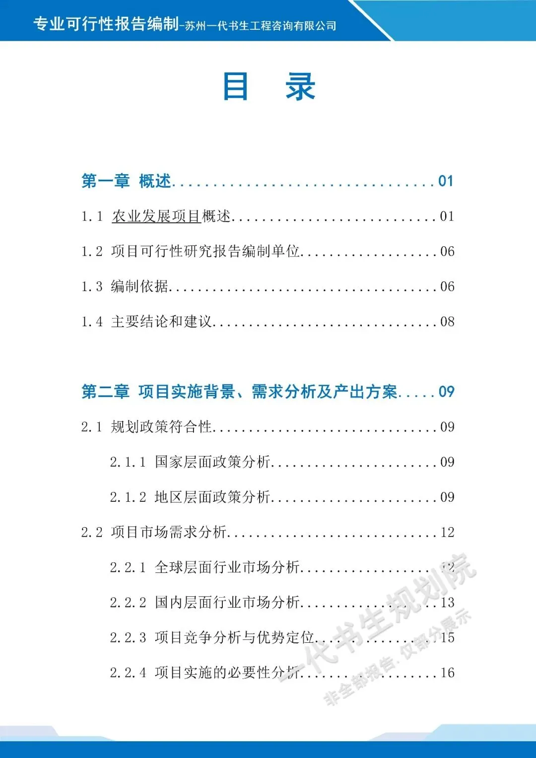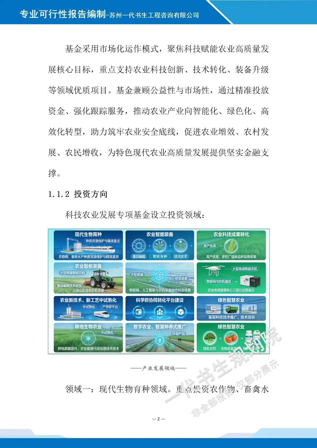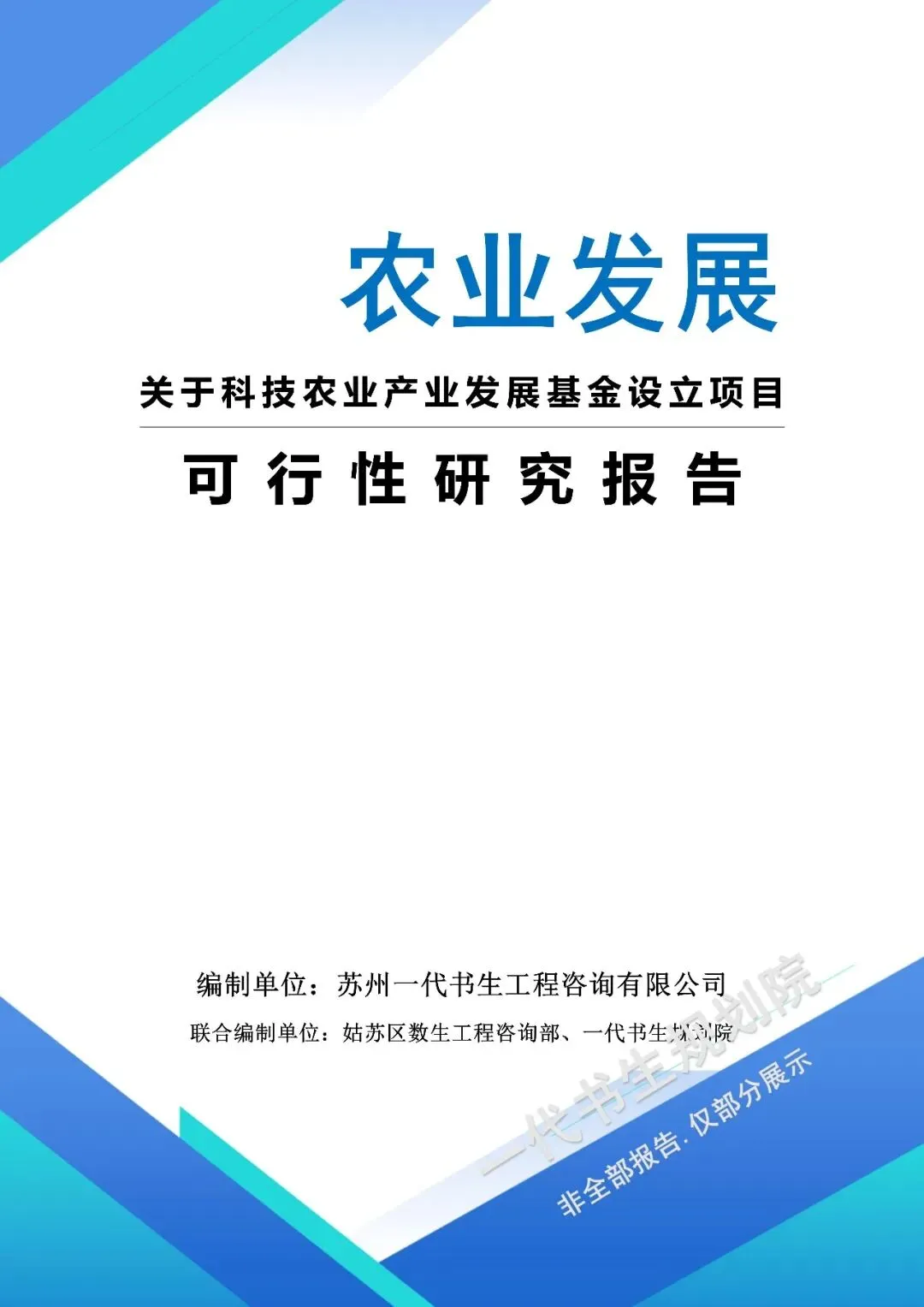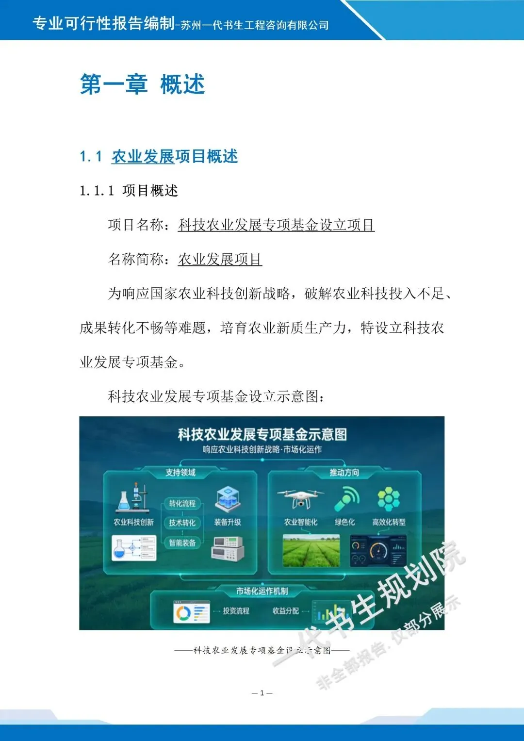 以下是《科技农业产业发站基金设立项目可行性研究报告》的案例展示,该项目可行性报告编制公司为苏州一代书生工程咨询有限公司。项目可行性研究报告编制、项目计划书编写,请联系:17312436919。科技农业产业发展基金设立可行性研究报告编制单位为由苏州一代书生工程咨询有限公司出具。苏州一代书生工程咨询有限公司,是集市场评估、产业策划与规划设计于一体,可为项目提供建设前期评估、落地规划设计,出具成果有:《行业市场调研分析报告》、《项目建议书(项目计划书)》、《项目可行性研究报告》、《项目初步设计方案》、《项目概念规划设计方案》、《项目建设总体规划设计方案》、《地区/片区/项目总体产业发展规划方案》等。