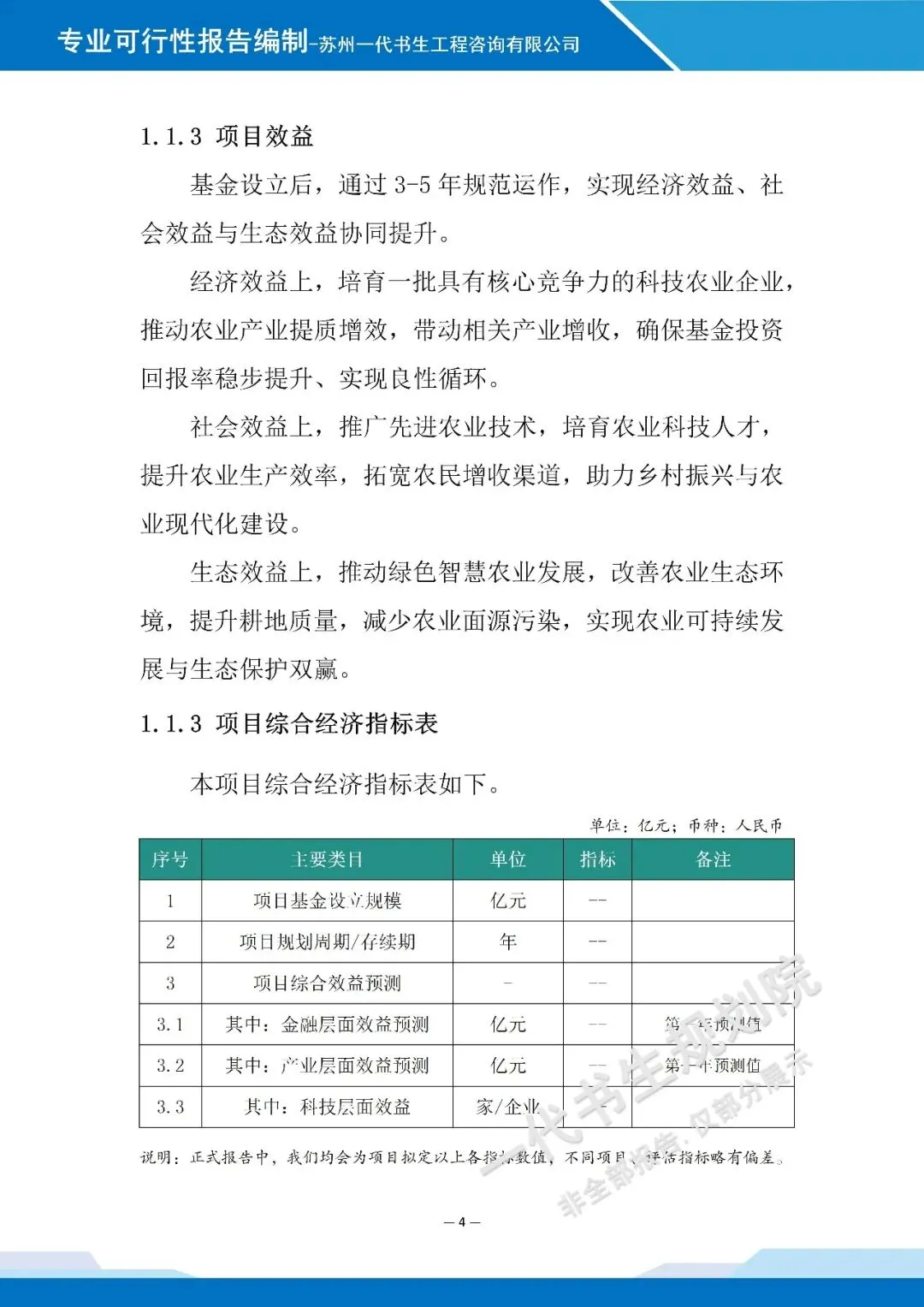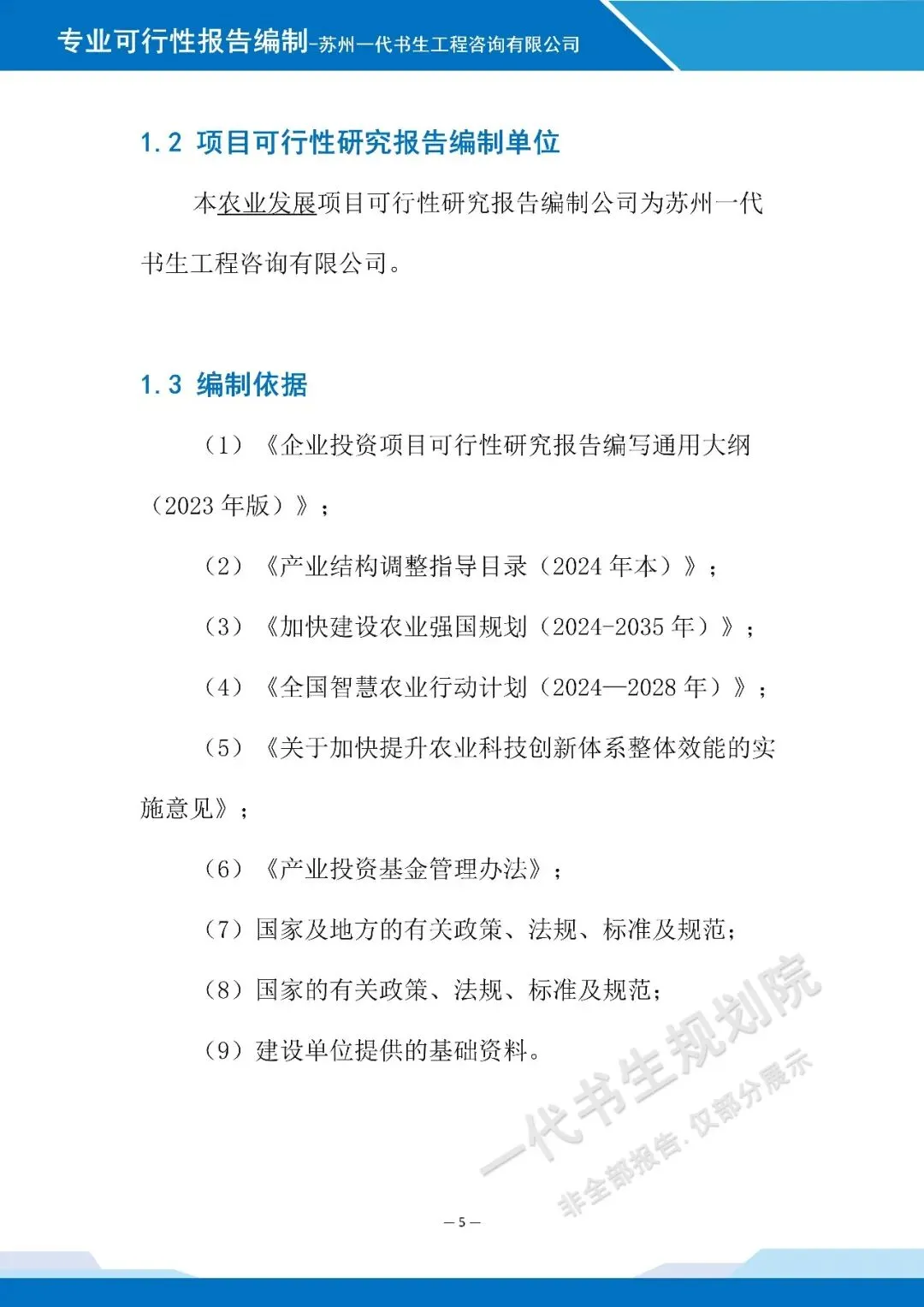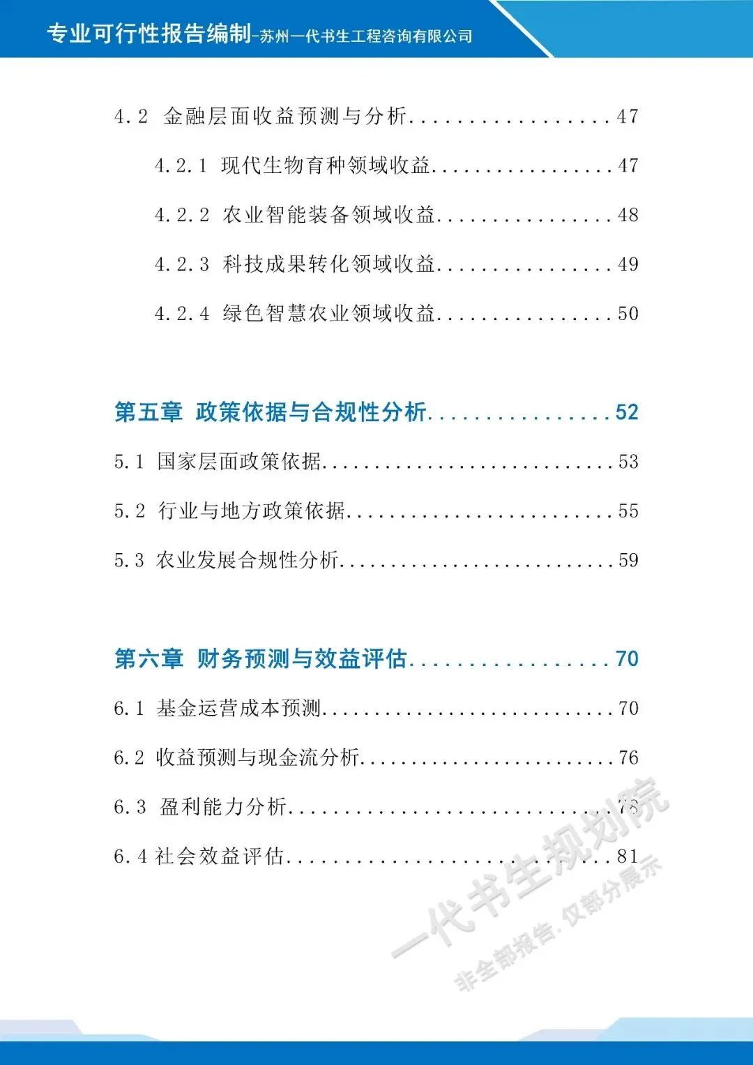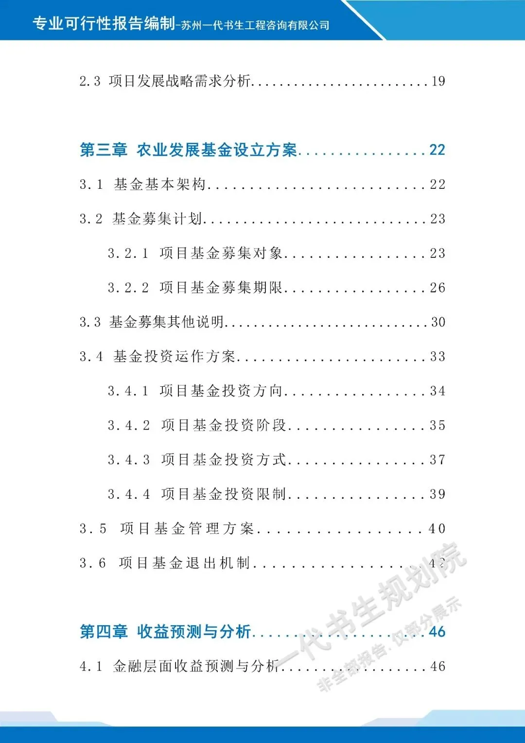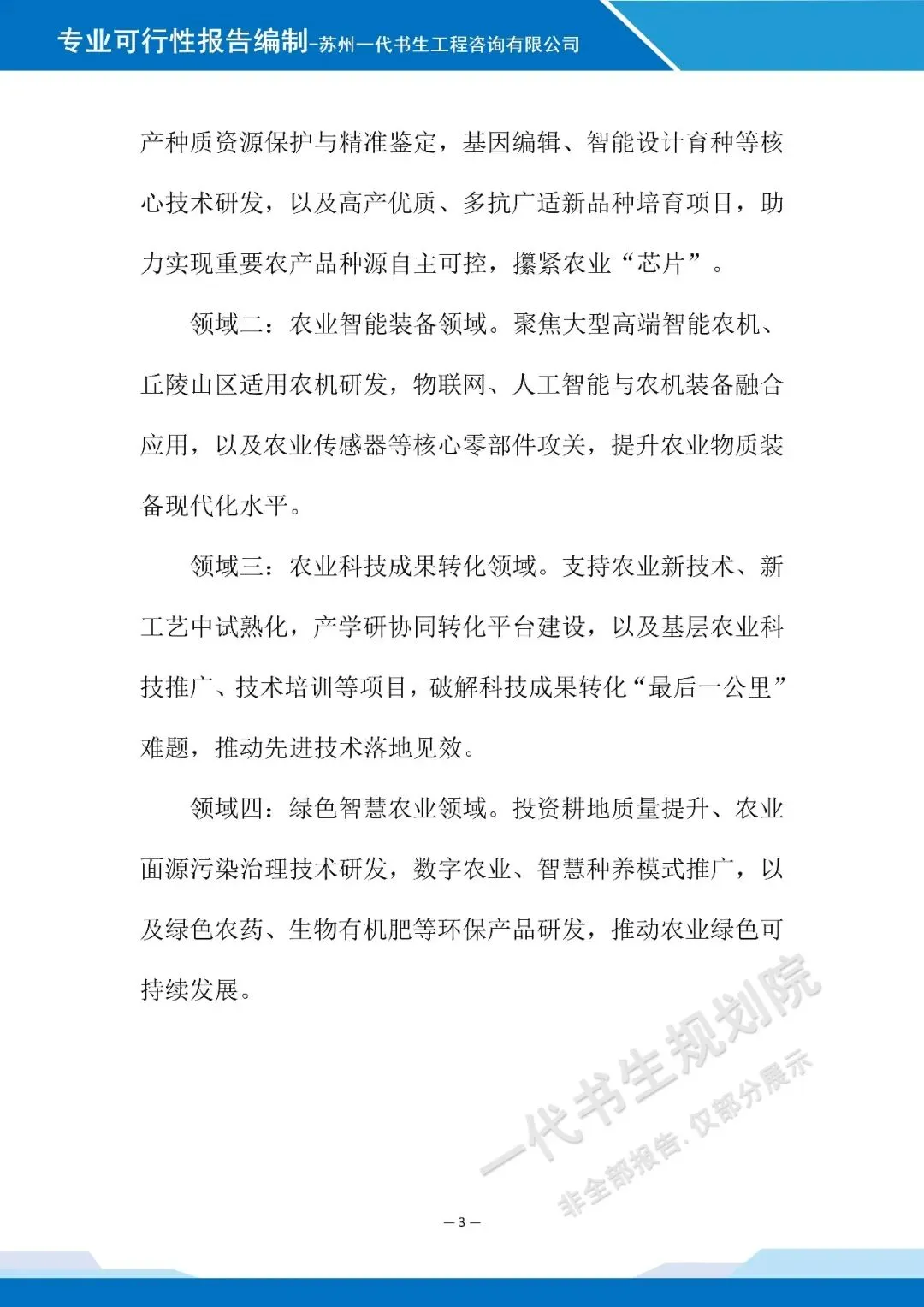 以下是《科技农业产业发站基金设立项目可行性研究报告》的案例展示,该项目可行性报告编制公司为苏州一代书生工程咨询有限公司。项目可行性研究报告编制、项目计划书编写,请联系:17312436919。科技农业产业发展基金设立可行性研究报告编制单位为由苏州一代书生工程咨询有限公司出具。苏州一代书生工程咨询有限公司,是集市场评估、产业策划与规划设计于一体,可为项目提供建设前期评估、落地规划设计,出具成果有:《行业市场调研分析报告》、《项目建议书(项目计划书)》、《项目可行性研究报告》、《项目初步设计方案》、《项目概念规划设计方案》、《项目建设总体规划设计方案》、《地区/片区/项目总体产业发展规划方案》等。