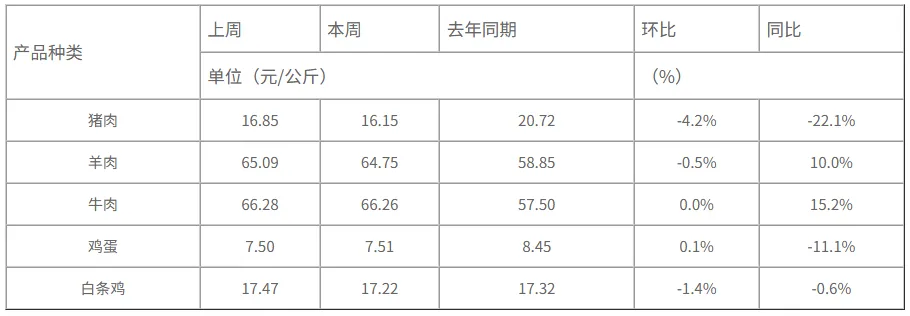 本周重点监测的畜禽产品猪肉、羊肉、牛肉、鸡蛋和白条鸡与上周相比,变化幅度在-4.2~0.1%之间(如表1所示)。