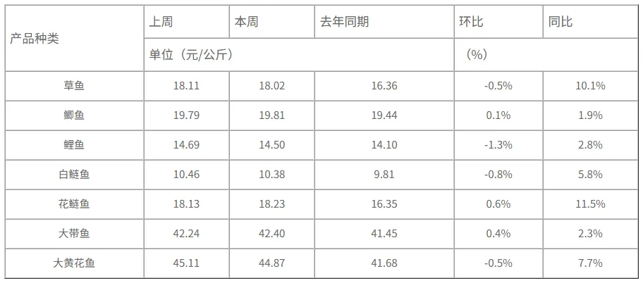 本周,重点监测的水产品草鱼、鲫鱼、鲤鱼、白鲢鱼、花鲢鱼、大带鱼和大黄花鱼与上周相比,变化幅度在-1.3~0.6%之间(如表2所示)。